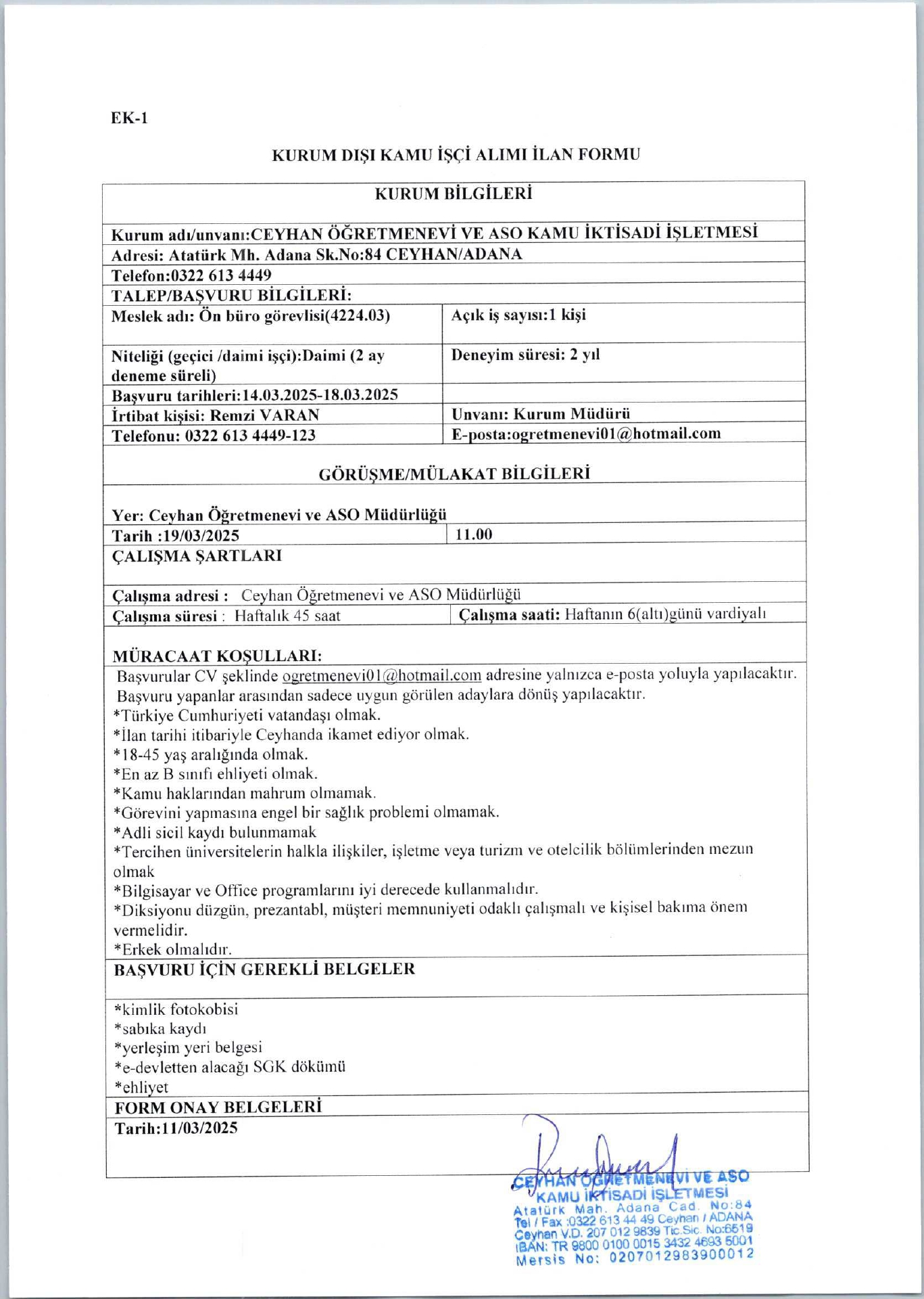 Adana Ceyhan Öğretmenevi Geçici 1 İşçi Alacak. Son başvuru tarihi 18 mart 2025