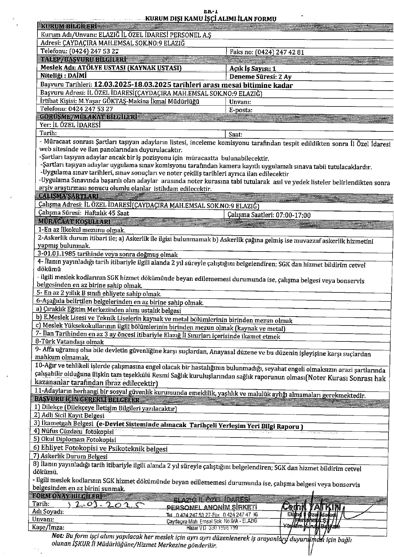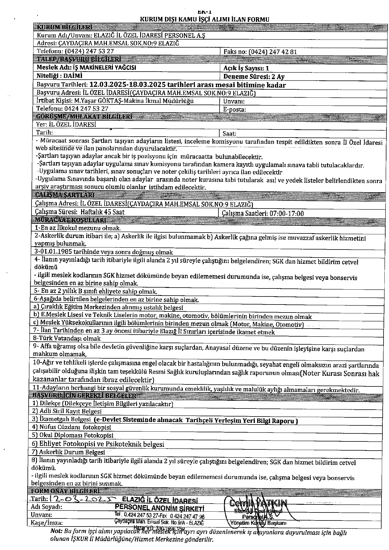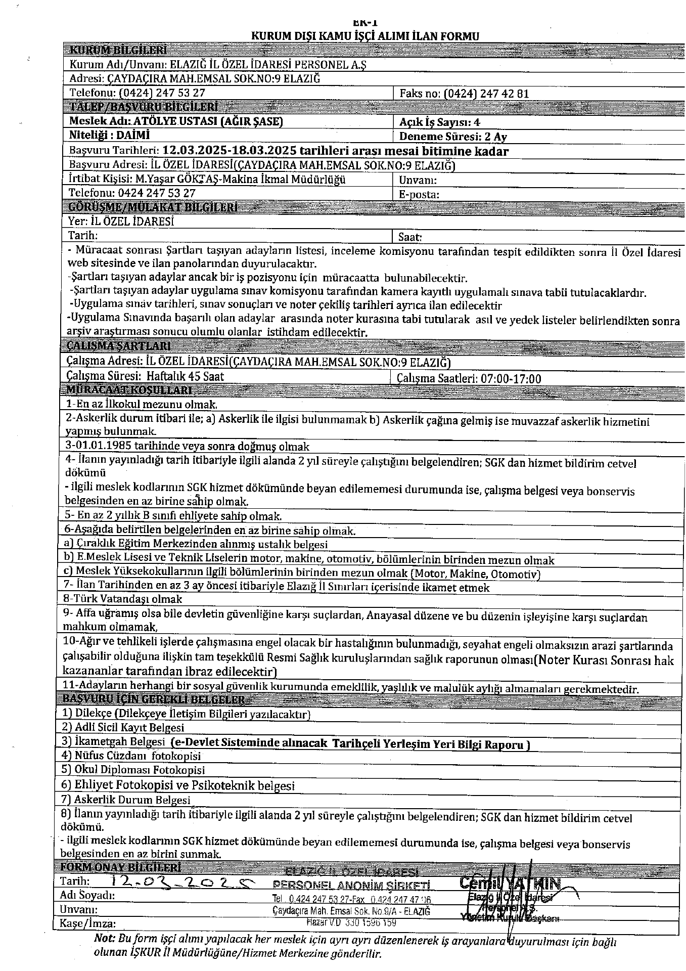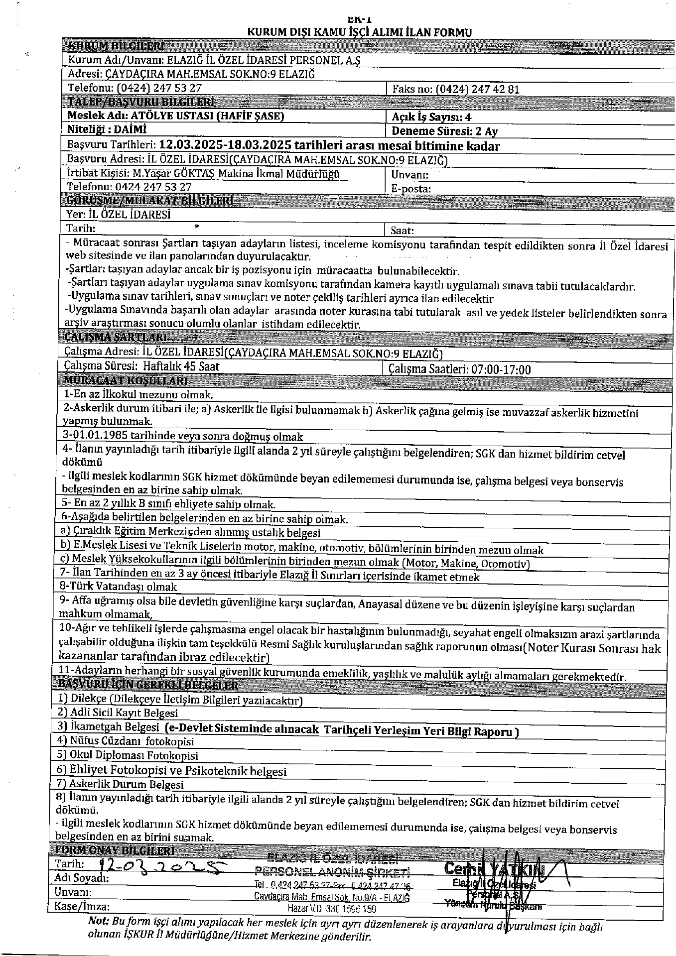 Elazığ İl Özel İdaresi 45 İşçi Alacak. Son başvuru tarihi 18 mart 2025