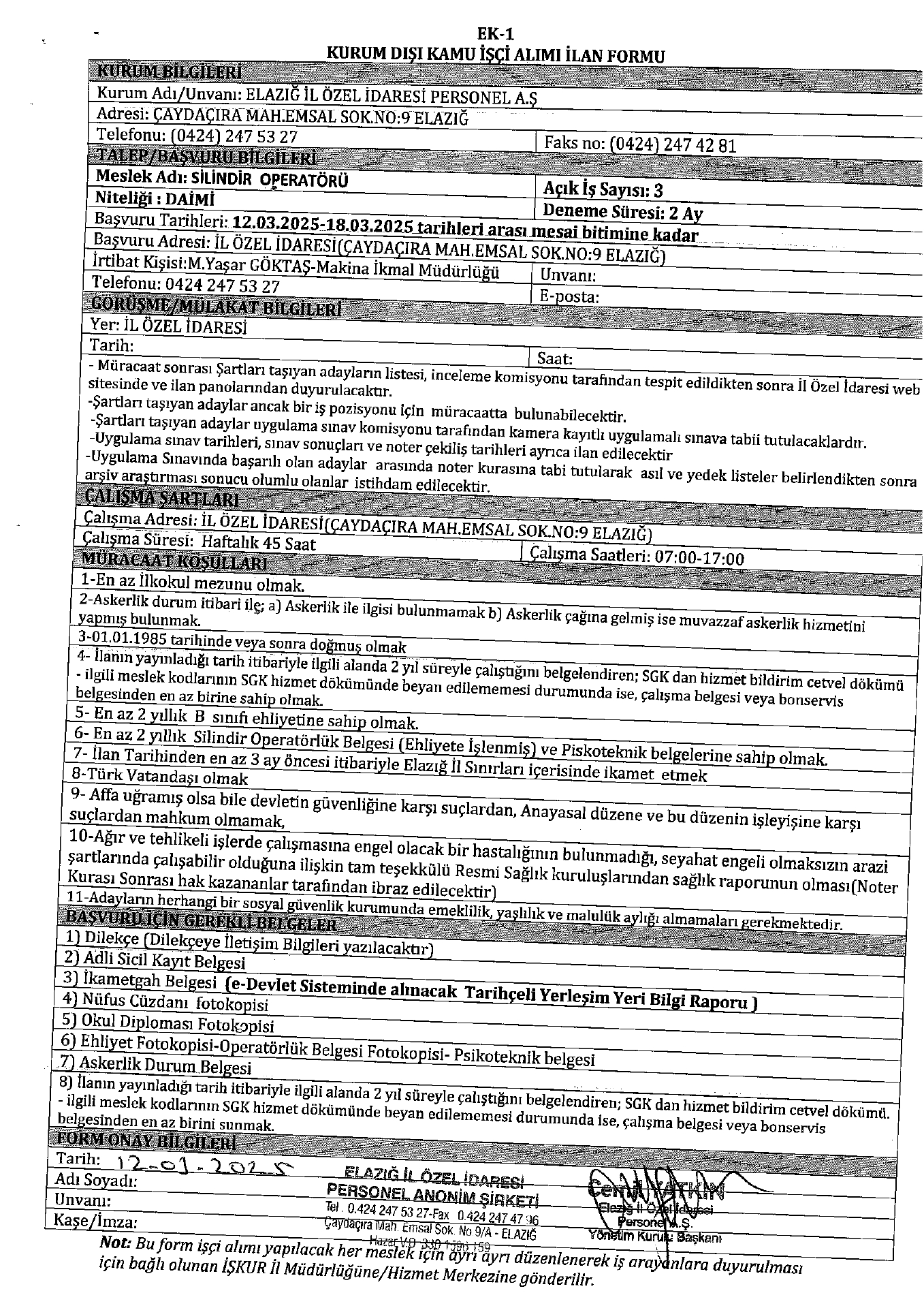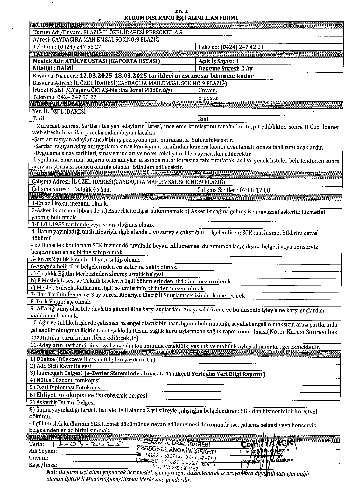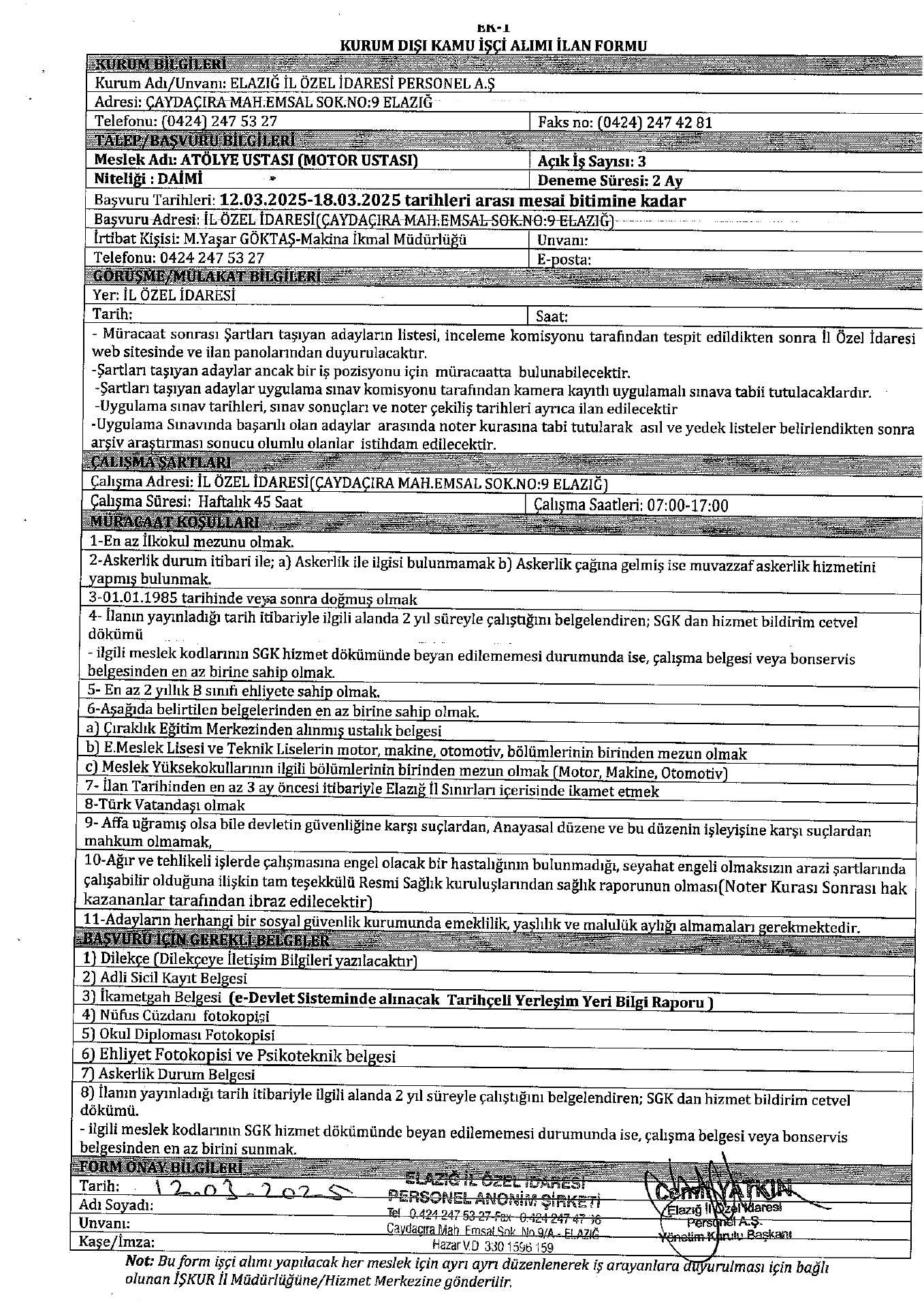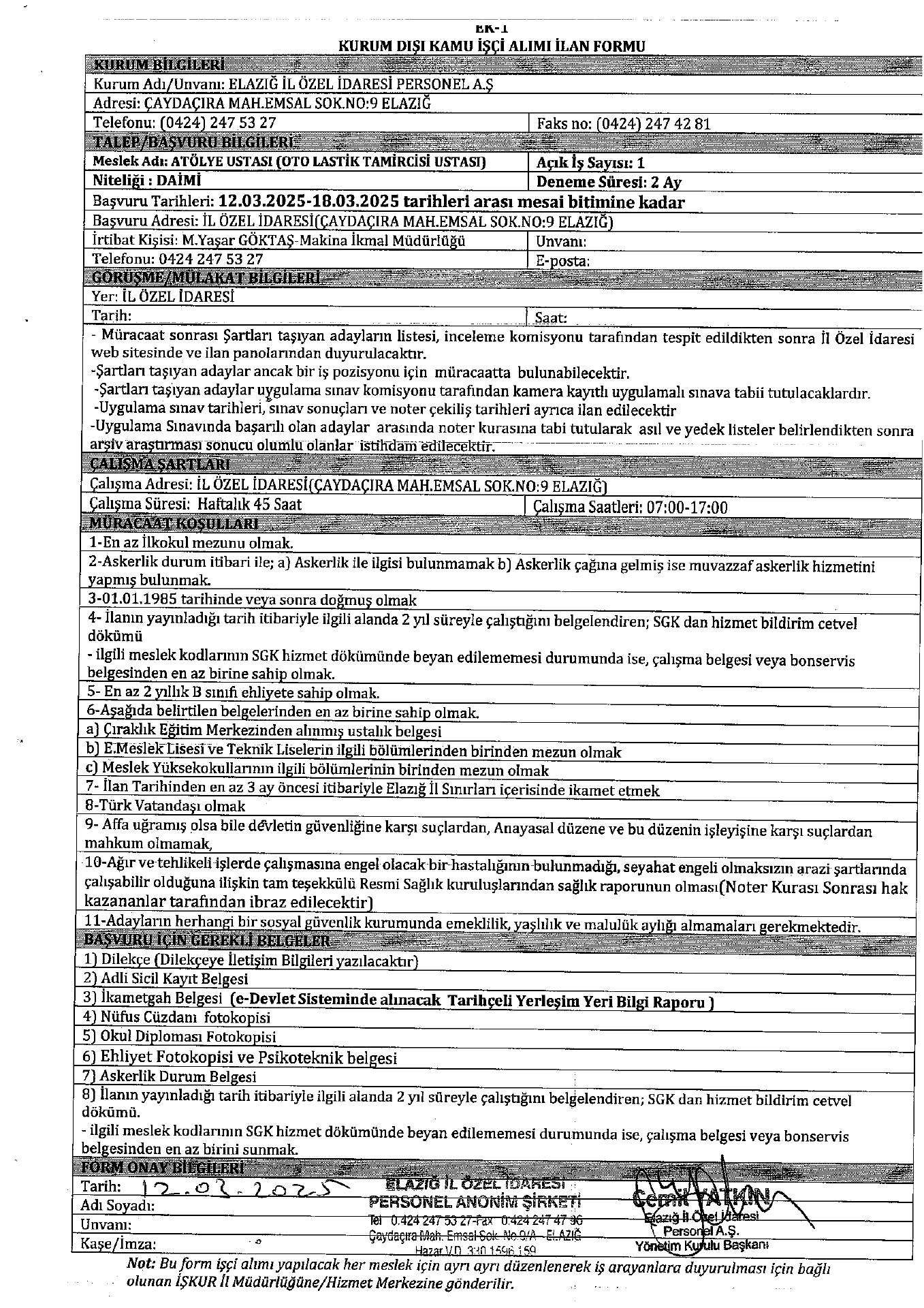 Elazığ İl Özel İdaresi 45 İşçi Alacak. Son başvuru tarihi 18 mart 2025