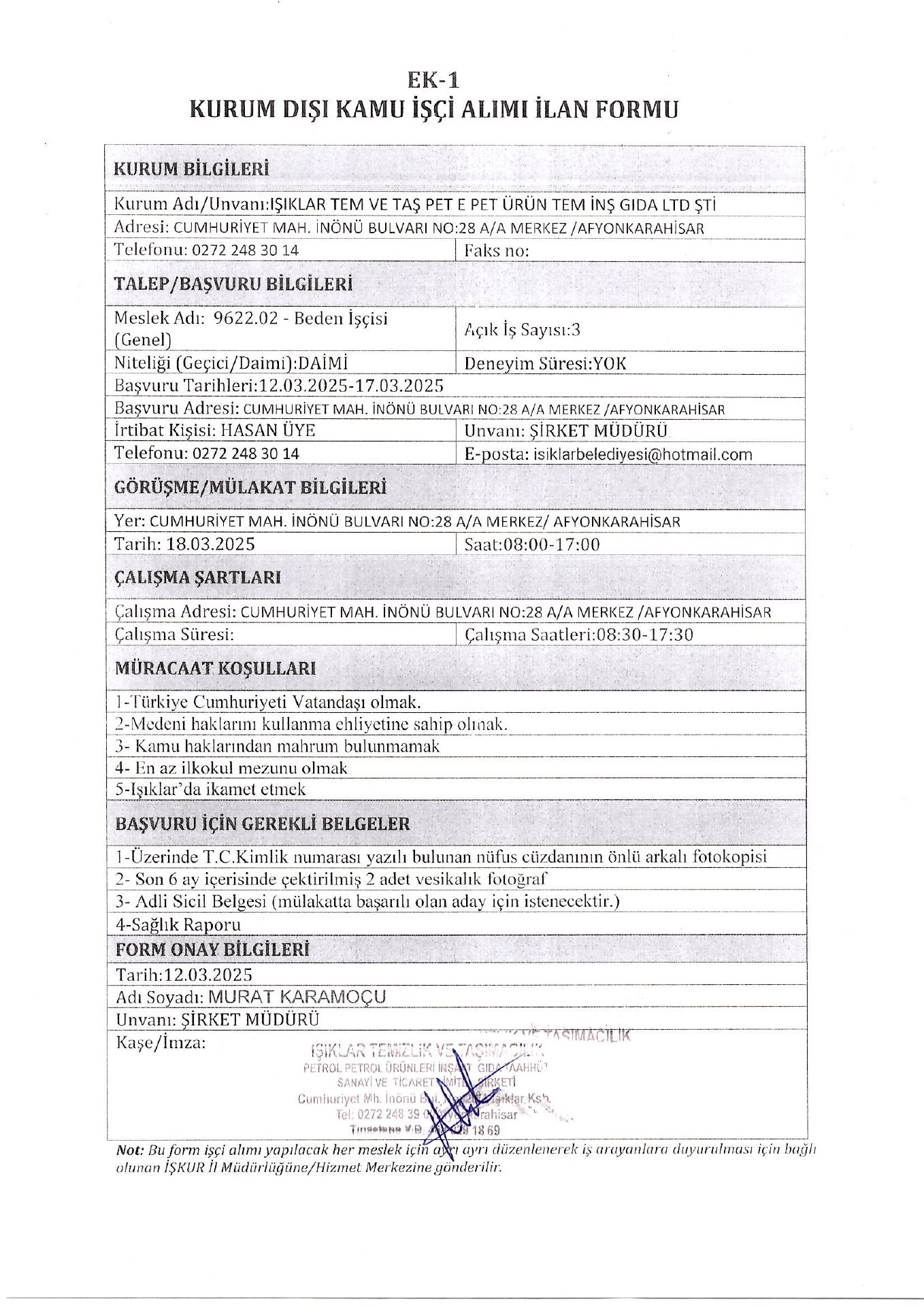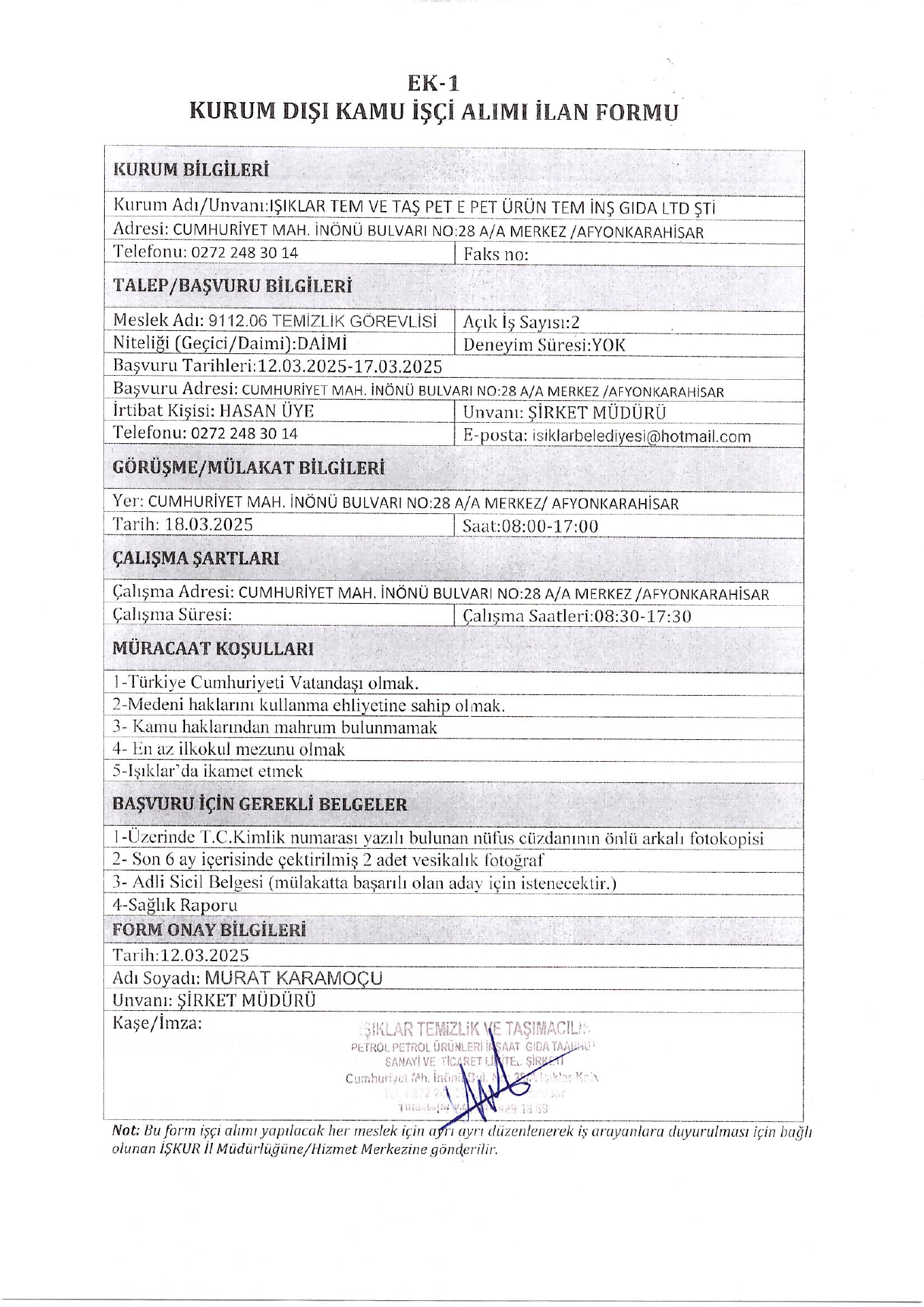 Afyonkarahisar Işıklar Temizlik 8 İşçi Alacak. Son başvuru tarihi 17 mart 2025
