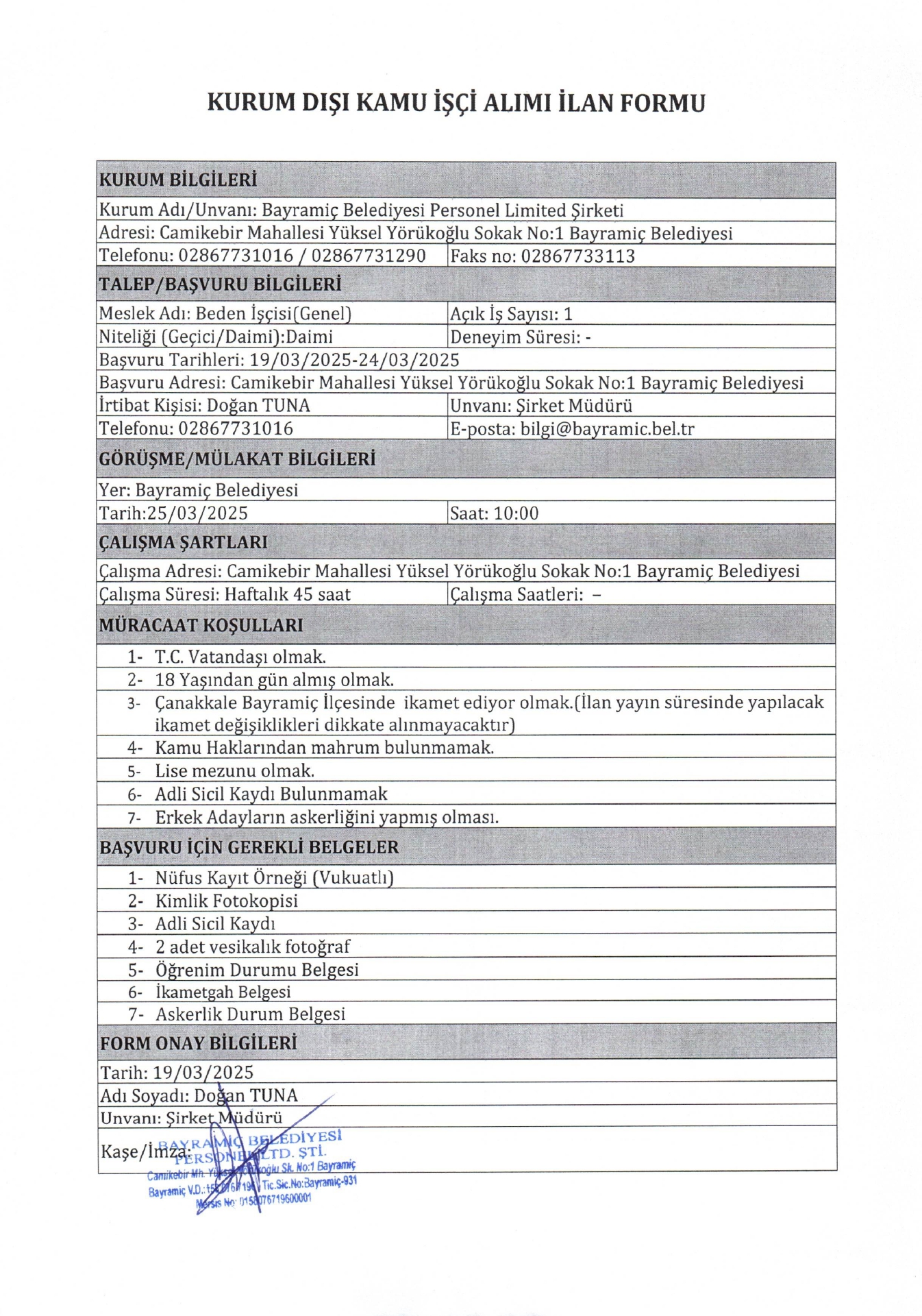 Bayramiç Belediyesi 1 İşçi Alacak. Son başvuru tarihi 24 mart 2025