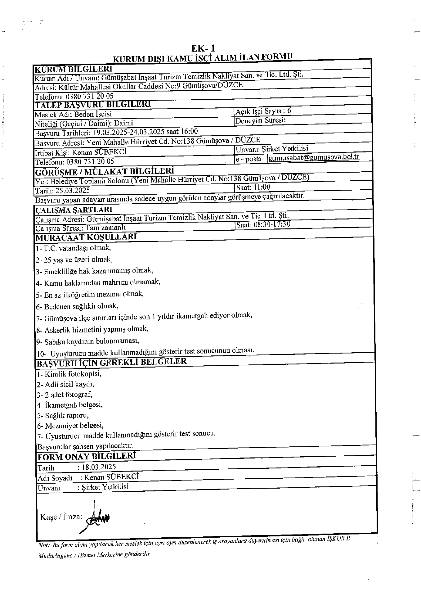 Düzce Gümüşabat İnşaat 5 İşçi Alacak. Son başvuru tarihi 24 mart 2025