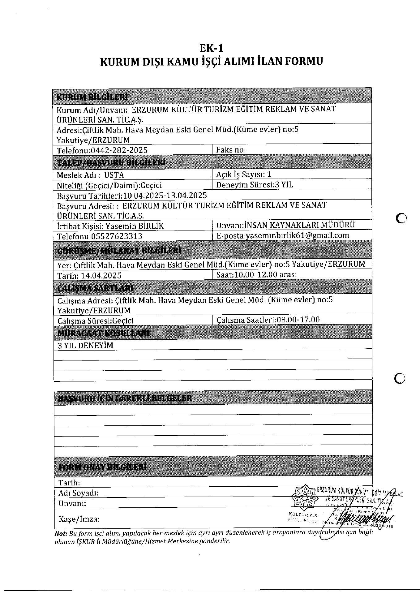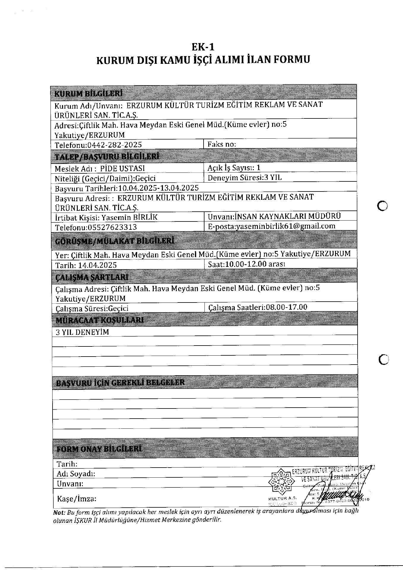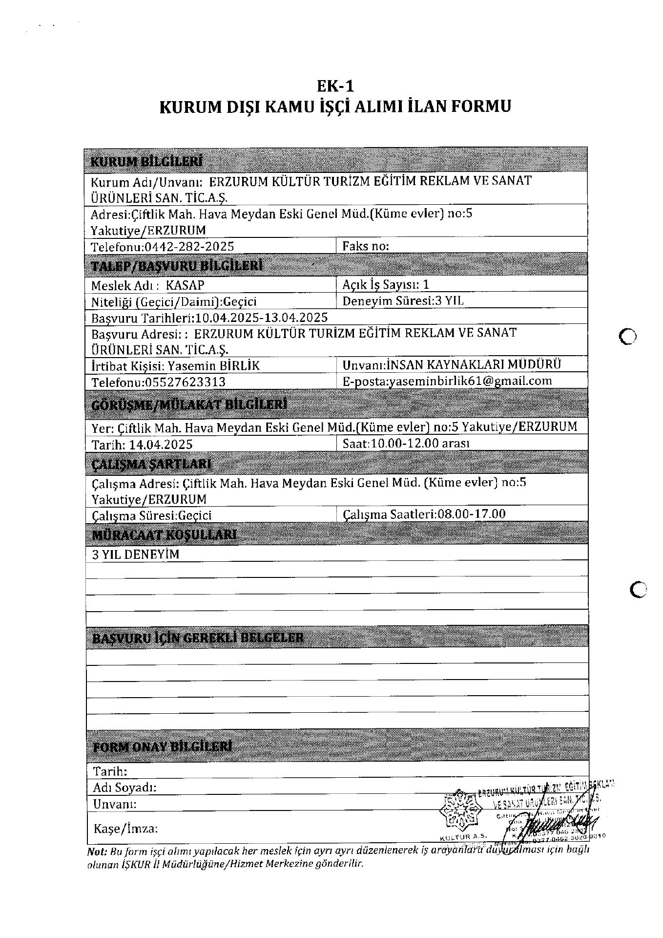 Erzurum Kültür Turizm Geçici 3 İşçi Alacak. Son başvuru tarihi 13 nisan 2025