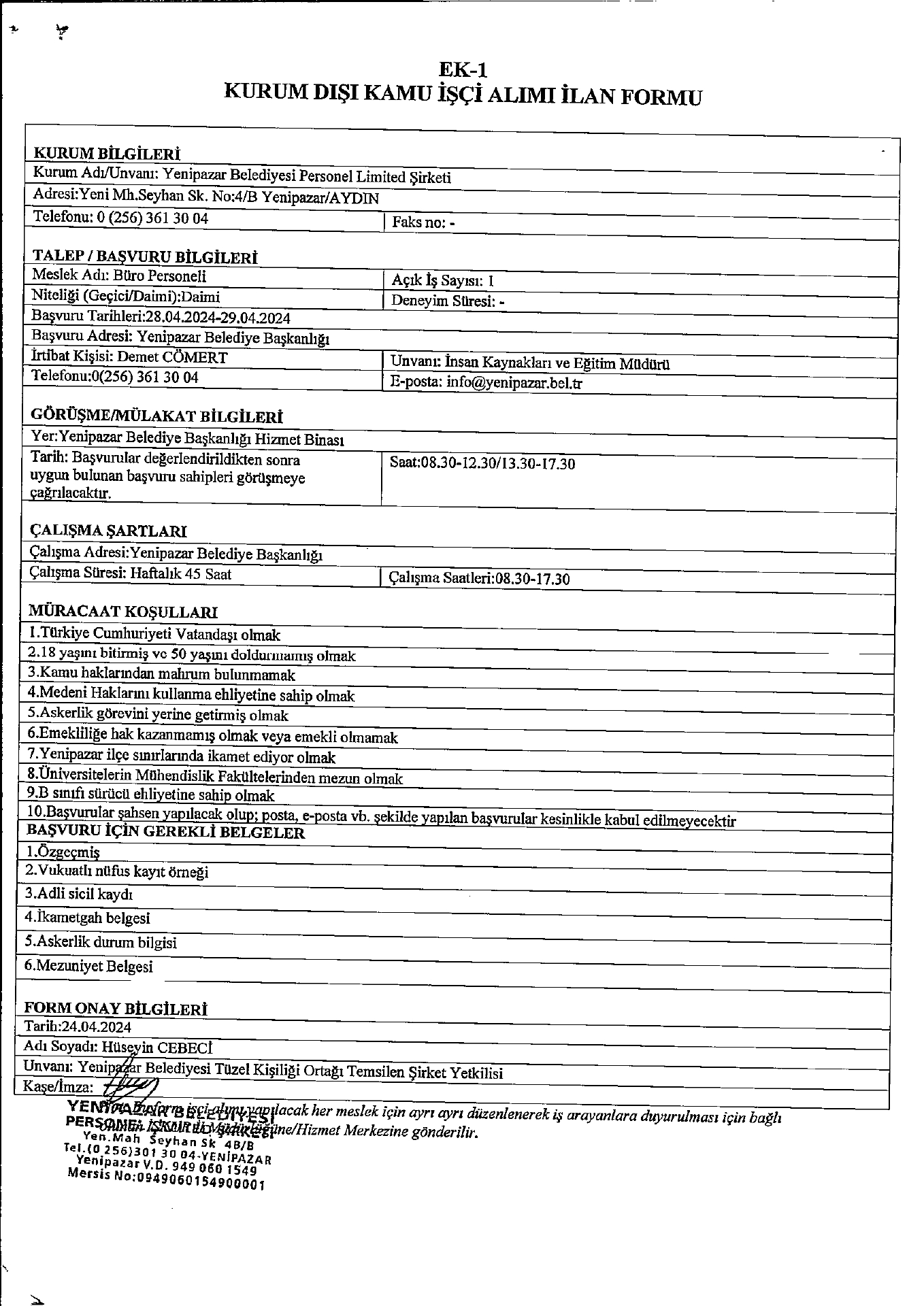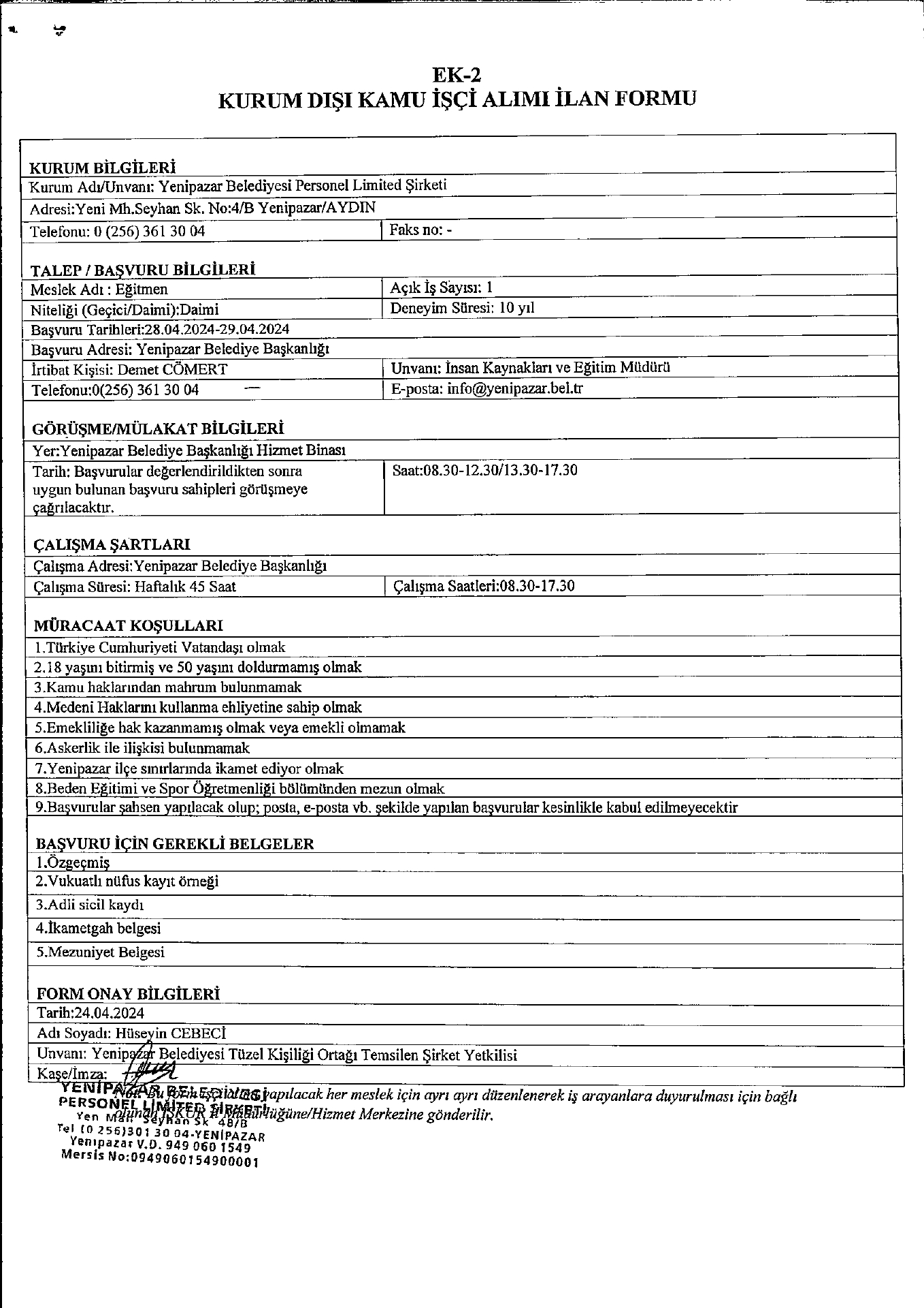 Aydın Yenipazar Belediyesi 2 İşçi Alacak. Son başvuru tarihi 29 nisan 2025