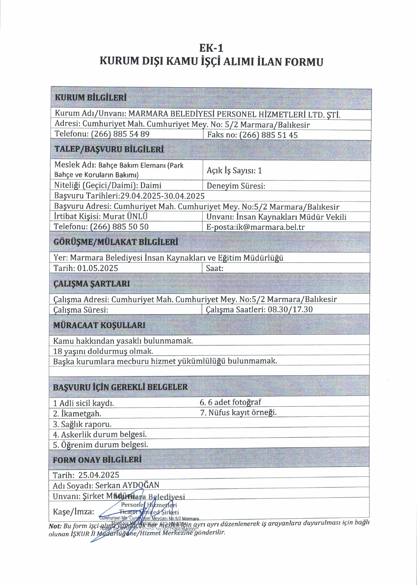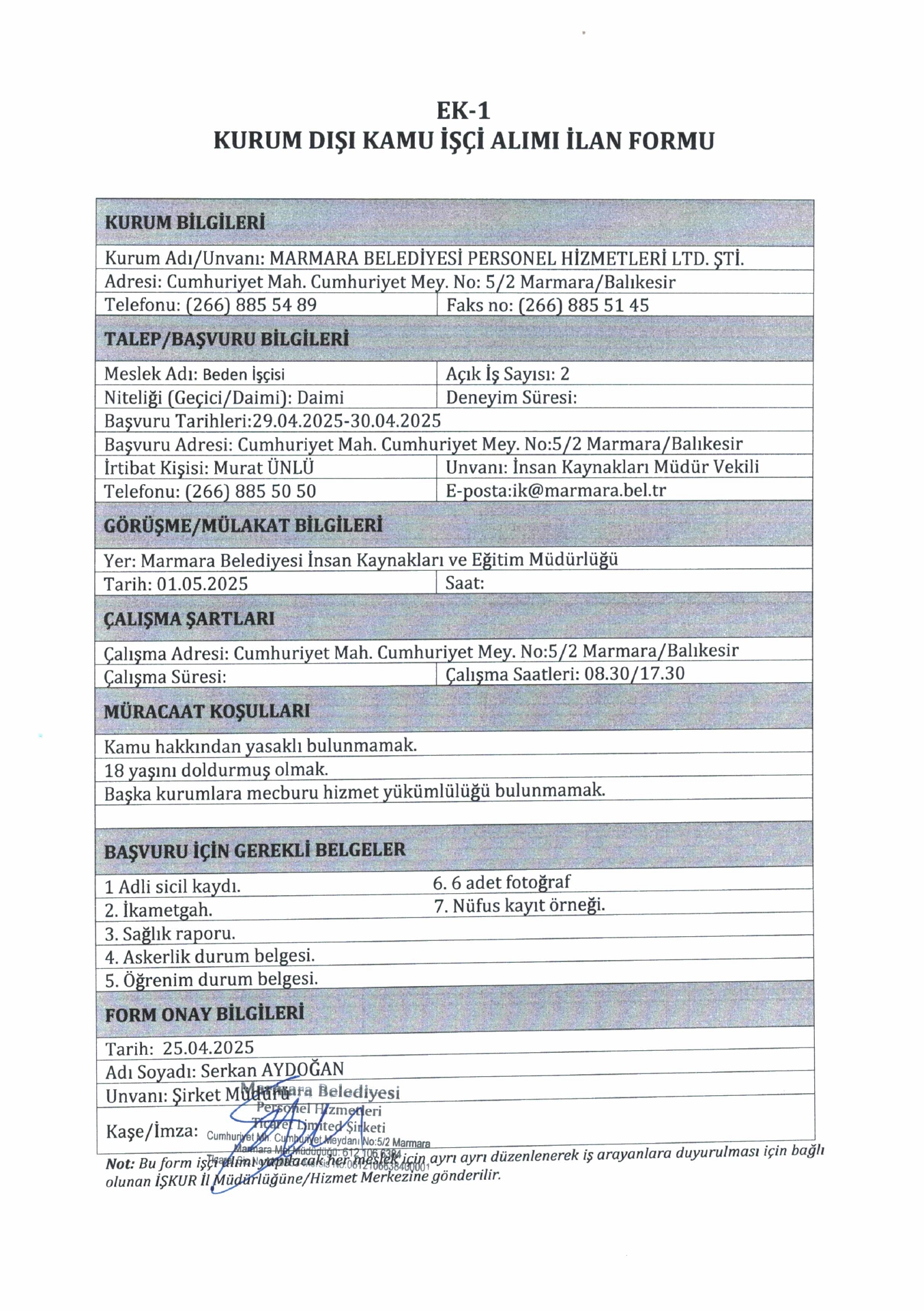 Balıkesir Marmara Belediyesi 2 İşçi Alacak. Son başvuru tarihi 30 nisan 2025