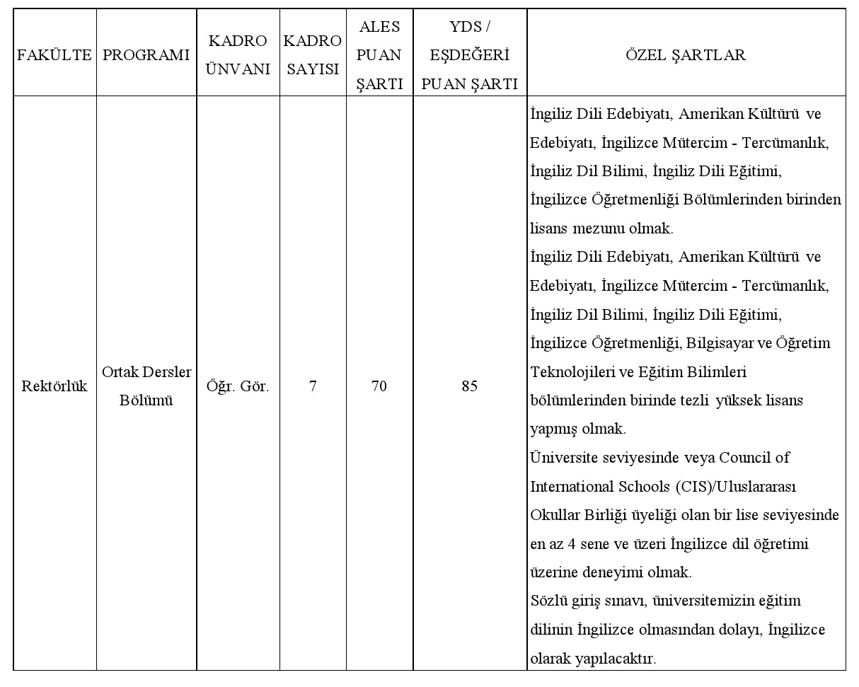 2547 sayılı Kanun ve Öğretim Üyesi Dışındaki Öğretim Elemanı Kadrolarına Yapılacak Atamalarda Uygulanacak Merkezi Sınav ile Giriş Sınavlarına İlişkin Usul ve Esaslar Hakkında Yönetmeliğin ilgili maddelerine göre aşağıda belirtilen akademik birime karşılarında belirtilen unvanlarda Öğretim Elemanı alınacaktır. Müracaat süresi ilanın yayım tarihinden itibaren 15 gün olup, başvurular kadro alımı yapacak olan ilgili birime istenen belgeler ile birlikte posta yoluyla yapılacaktır. (Not: Süresi içerisinde yapılmayan ve eksik belgesi olan başvurular kabul edilmeyecektir.)