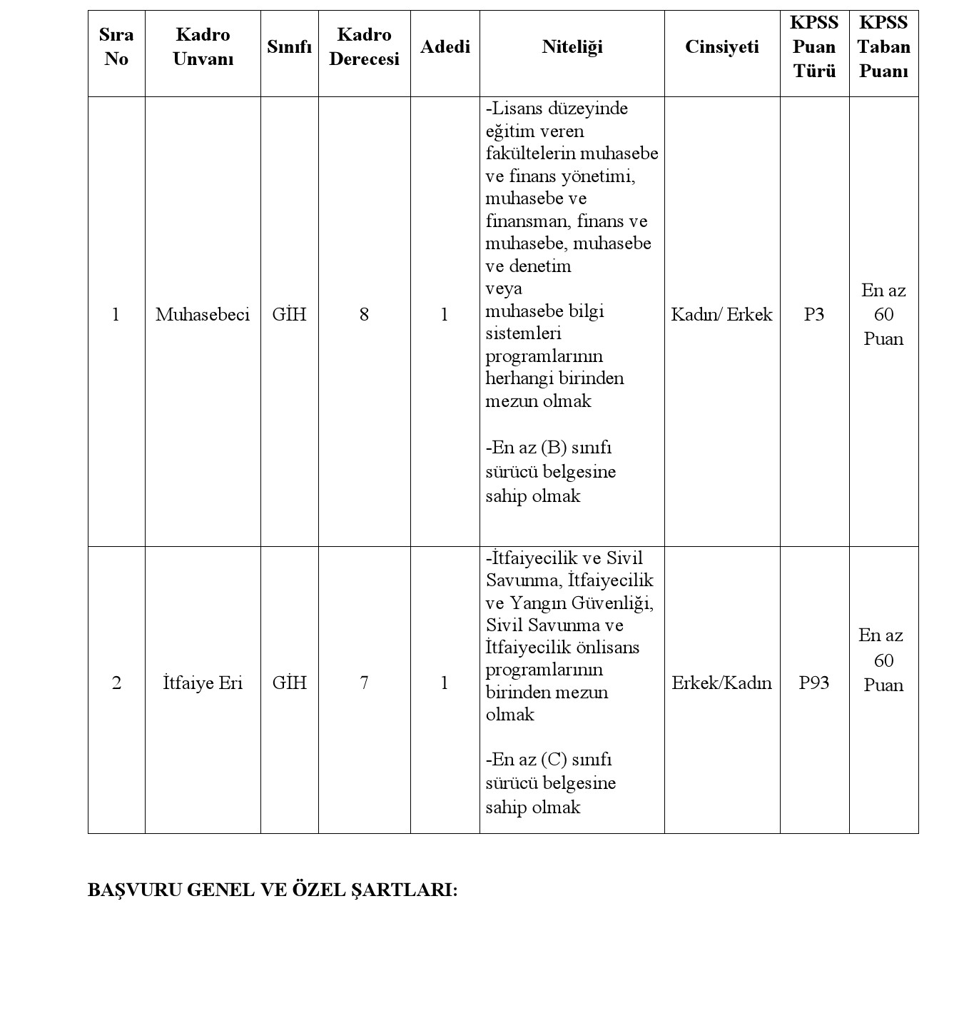 Belediyemize yukarıda belirtilen boş memur ve itfaiye eri kadroları için yapılacak başvurularda uyulması gereken genel ve özel şartlar aşağıda belirtilmiştir.