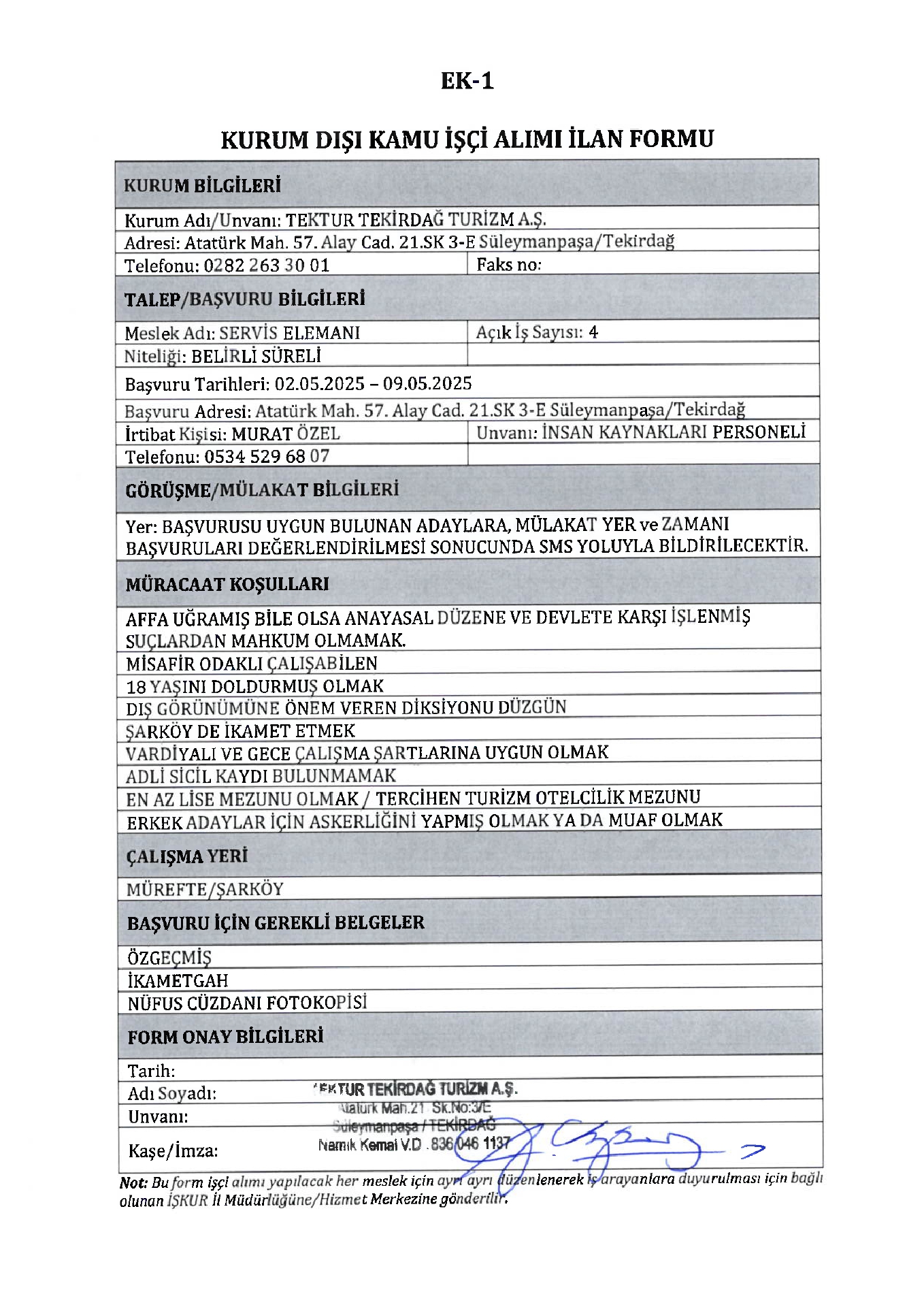 Tekirdağ Tektur 4 İşçi Alacak. Son başvuru tarihi 09 mayıs 2025