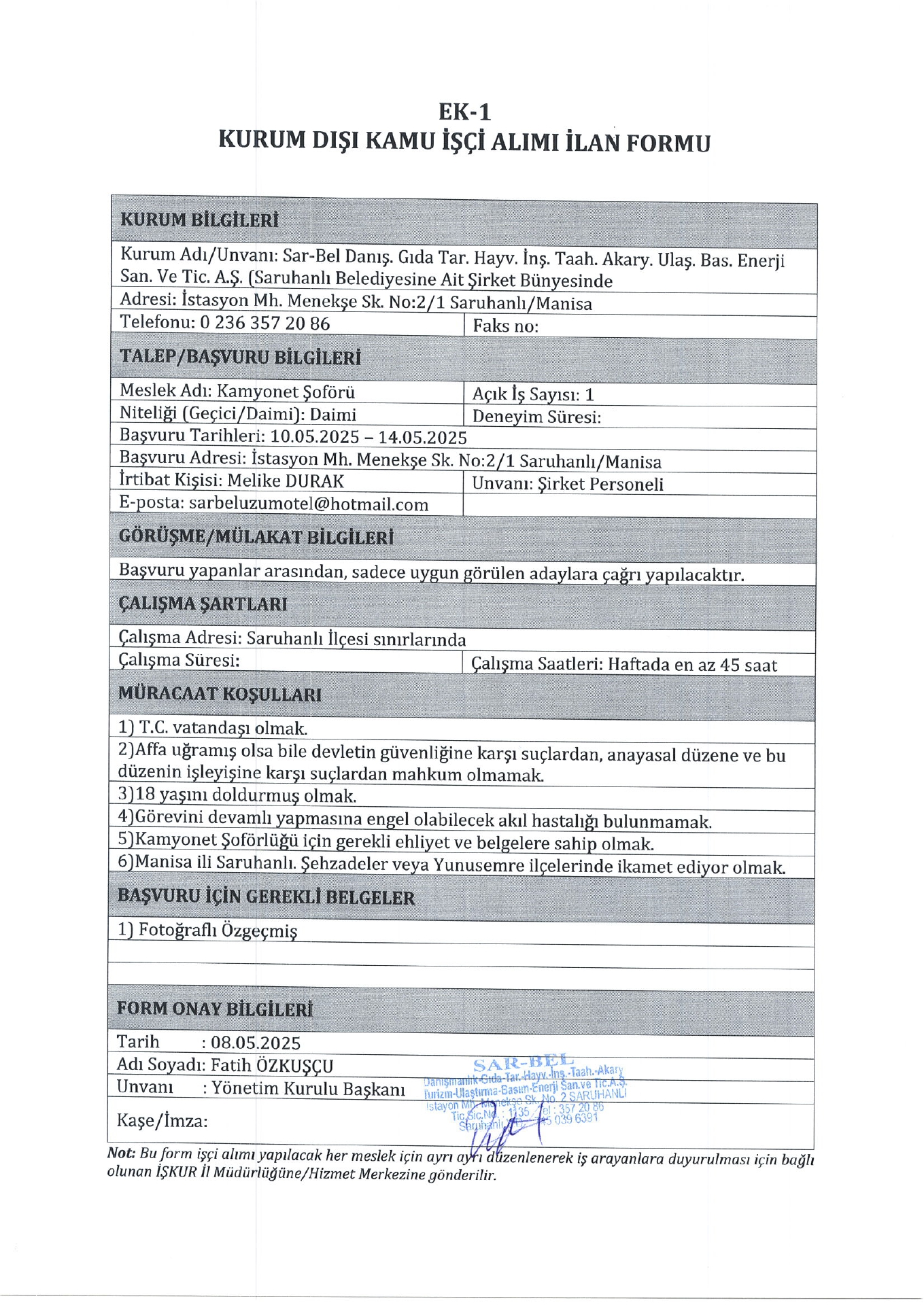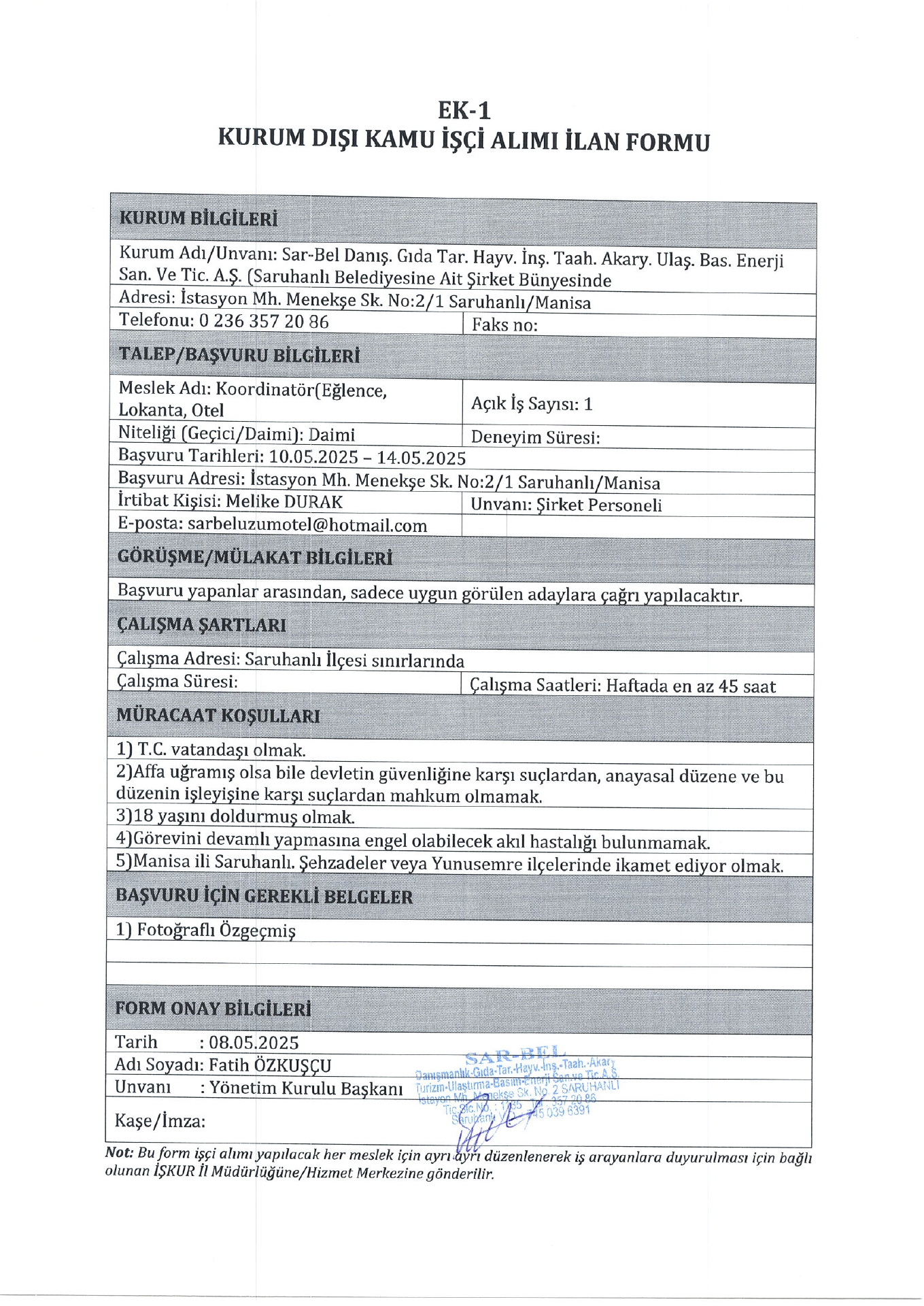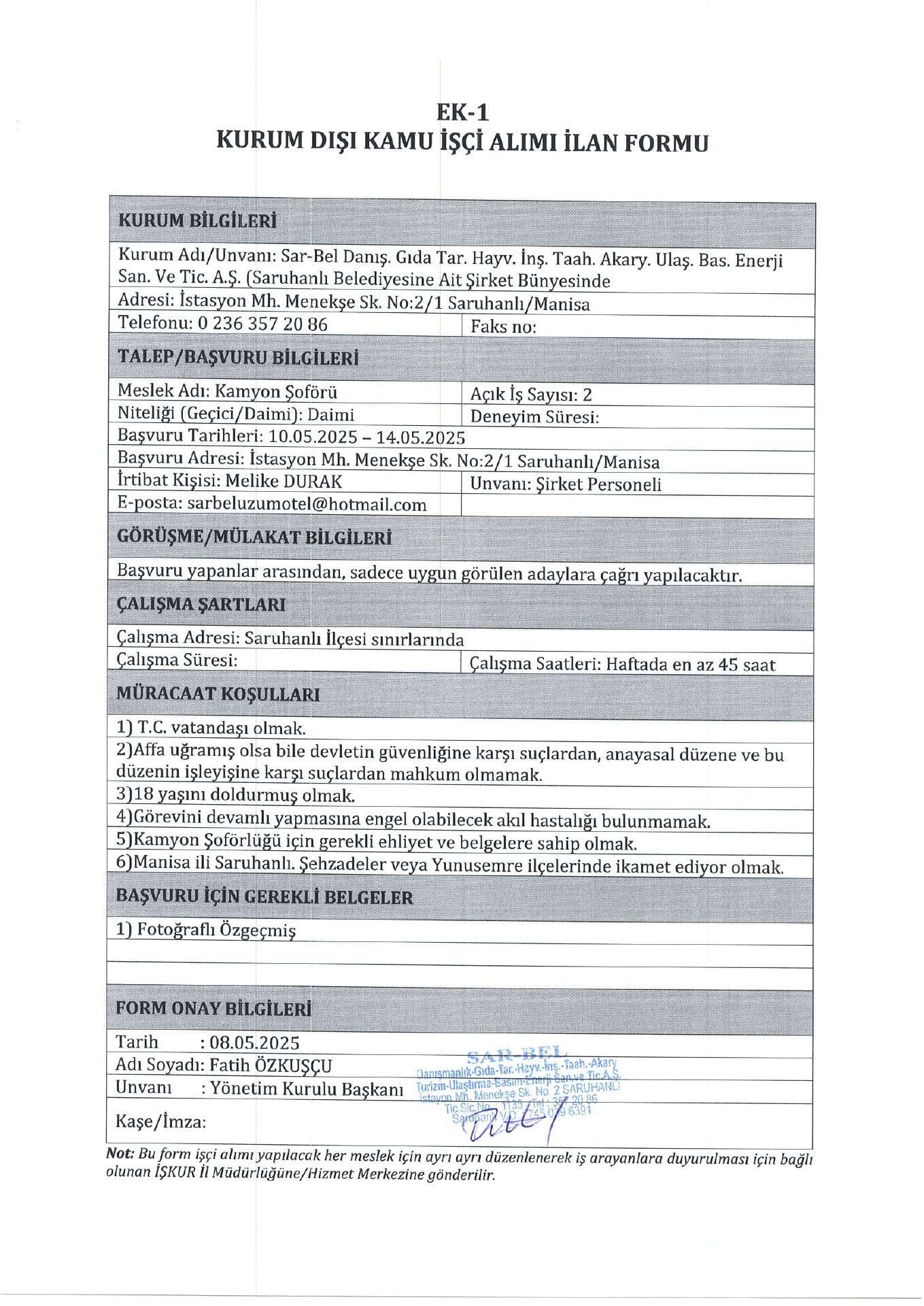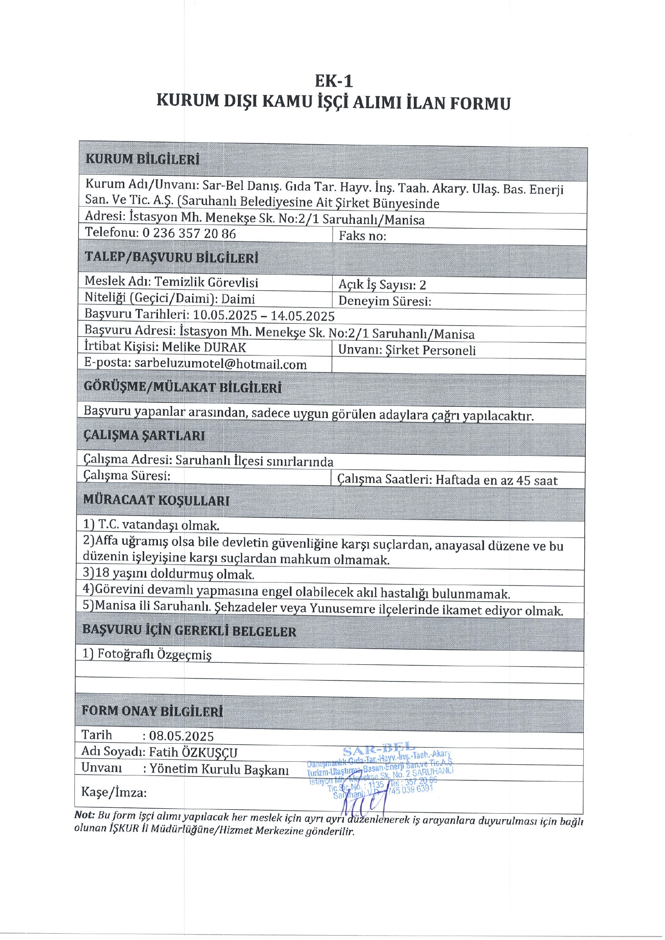 Manisa Sarbel 23 İşçi Alacak. Son başvuru tarihi 14 mayıs 2025