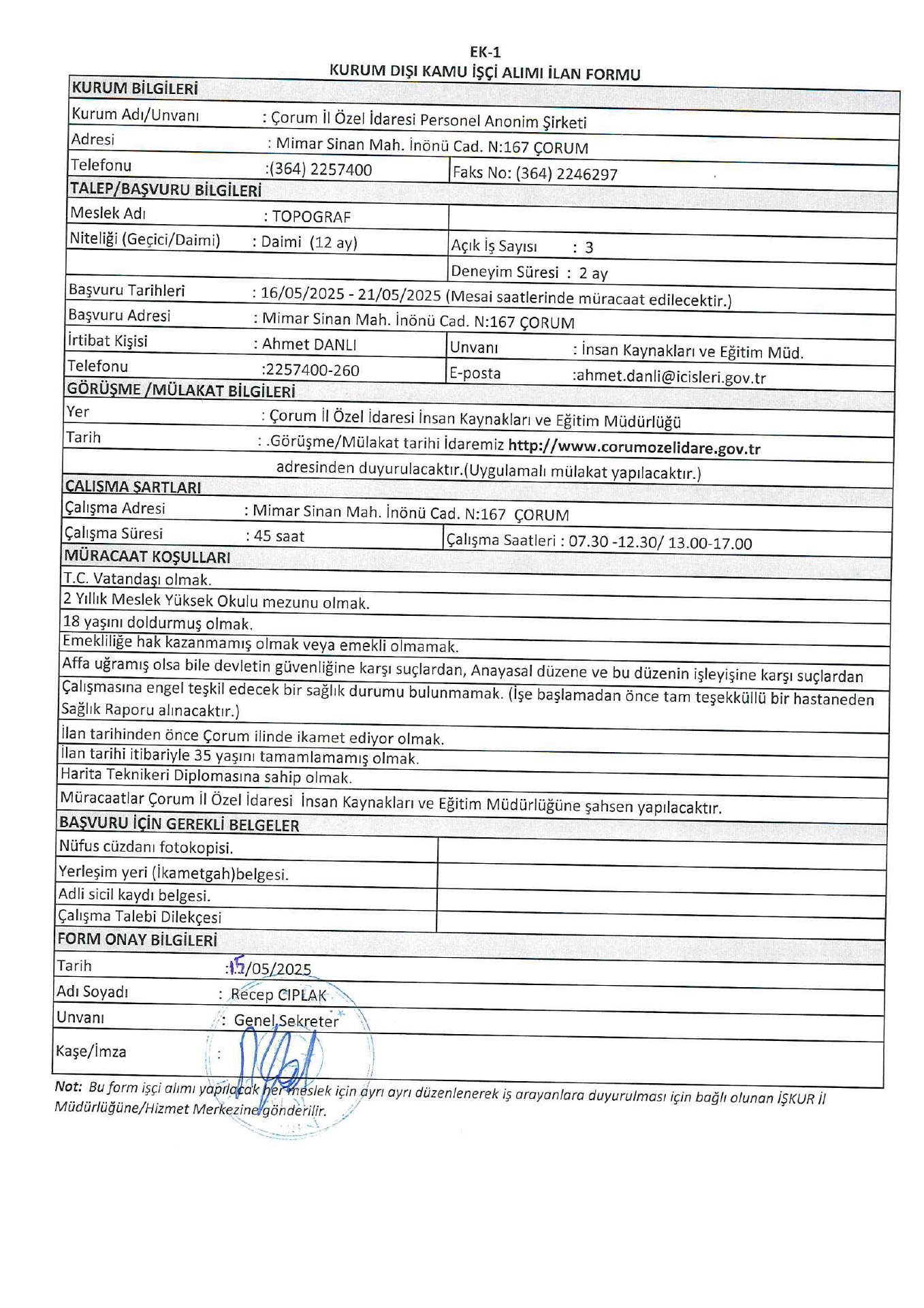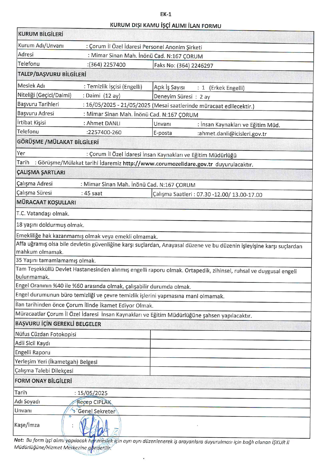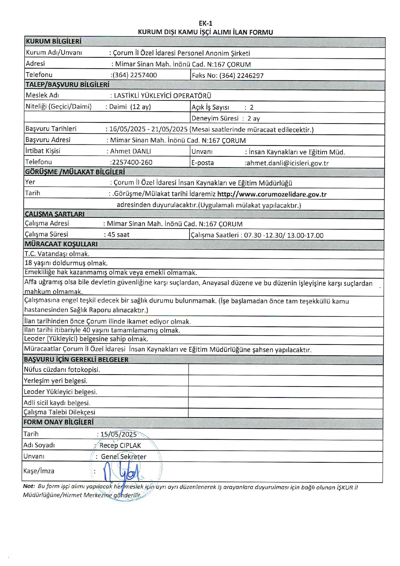 Çorum İl Özel İdaresi 70 İşçi Alacak. Son başvuru tarihi 21 mayıs 2025
