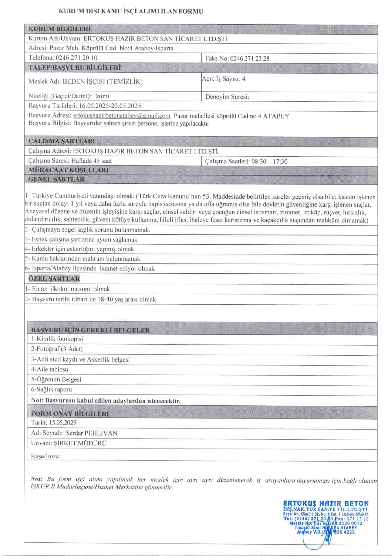Isparta Ertokuş Hazır Beton 15 İşçi Alacak. Son başvuru tarihi 20 mayıs 2025