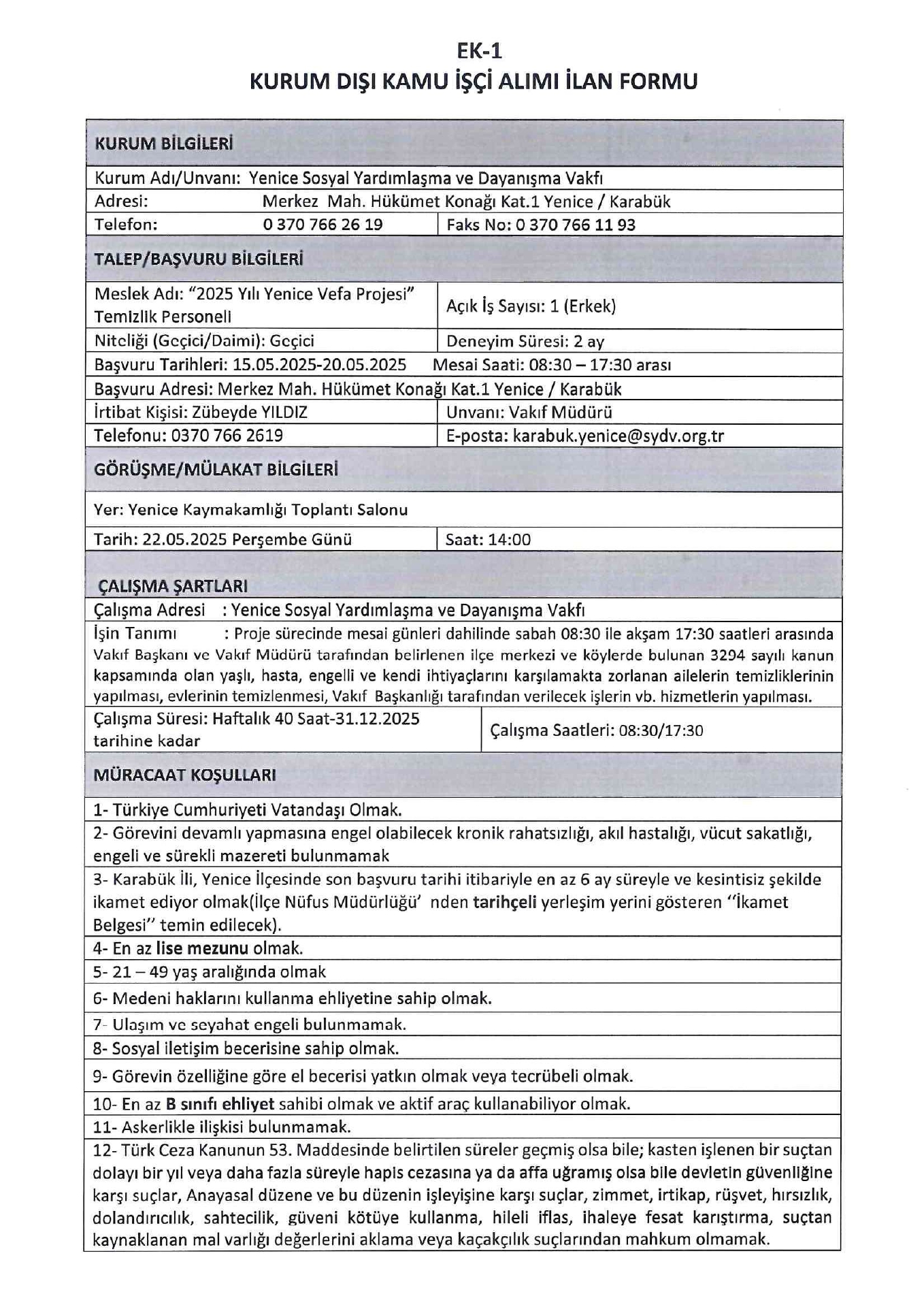 Karabük Yenice SYDV Geçici 1 İşçi Alacak. Son başvuru tarihi 20 mayıs 2025