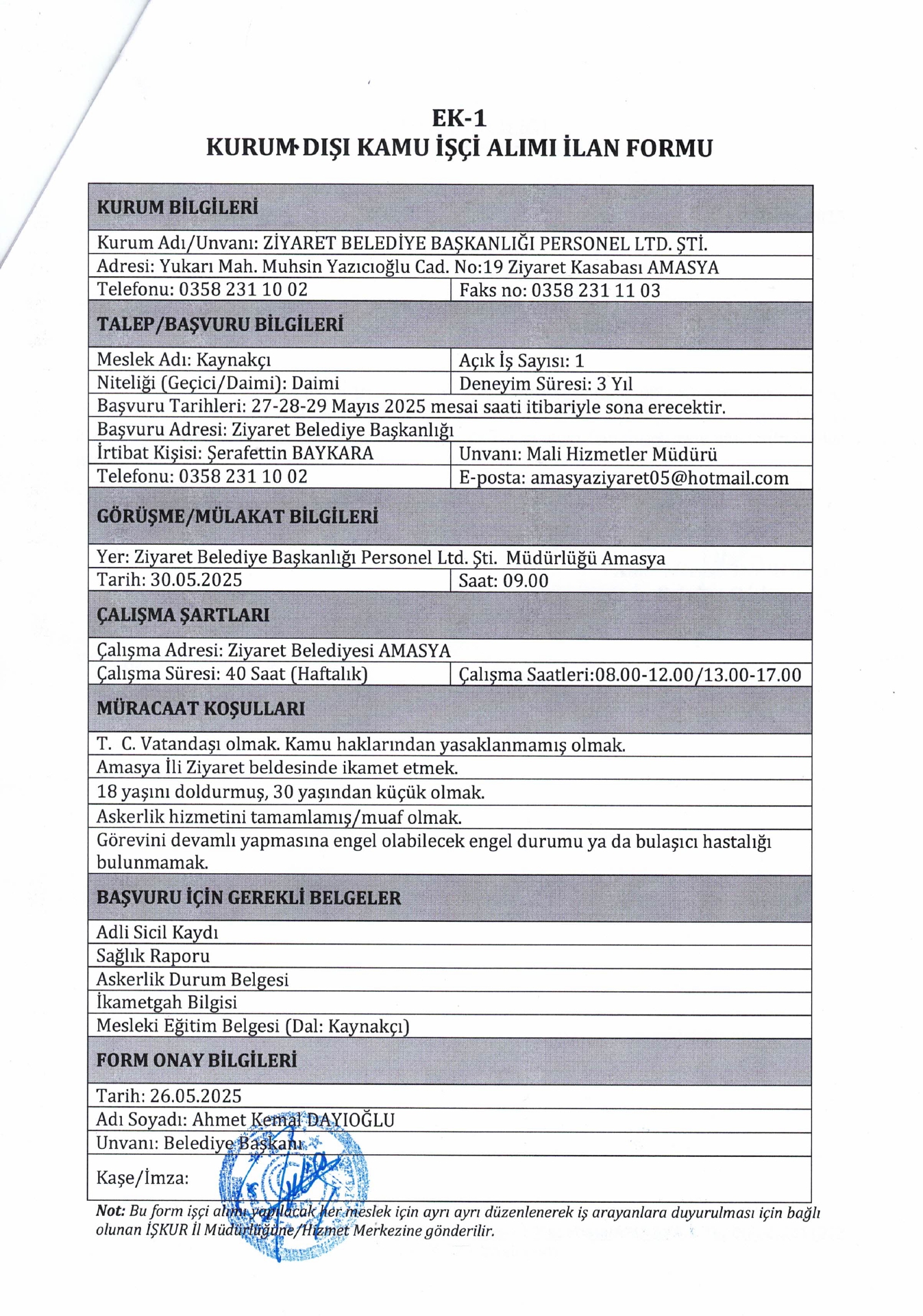Amasya Ziyaret Belediyesi 1 İşçi Alacak. Son başvuru tarihi 29 mayıs 2025