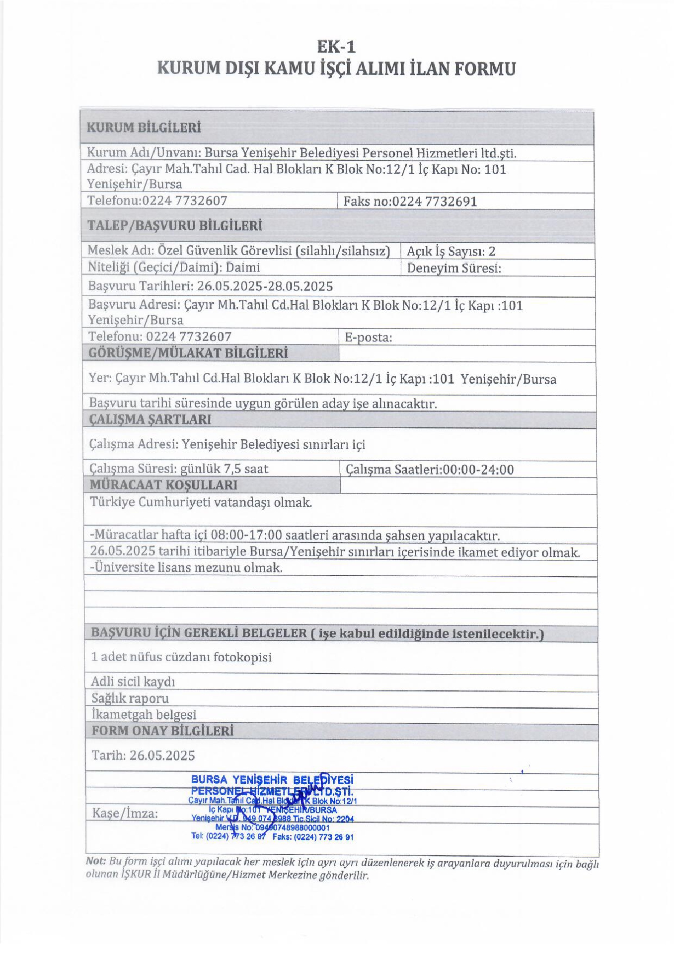 Bursa Yenişehir Belediyesi 2 İşçi Alacak. Son başvuru tarihi 28 mayıs 2025