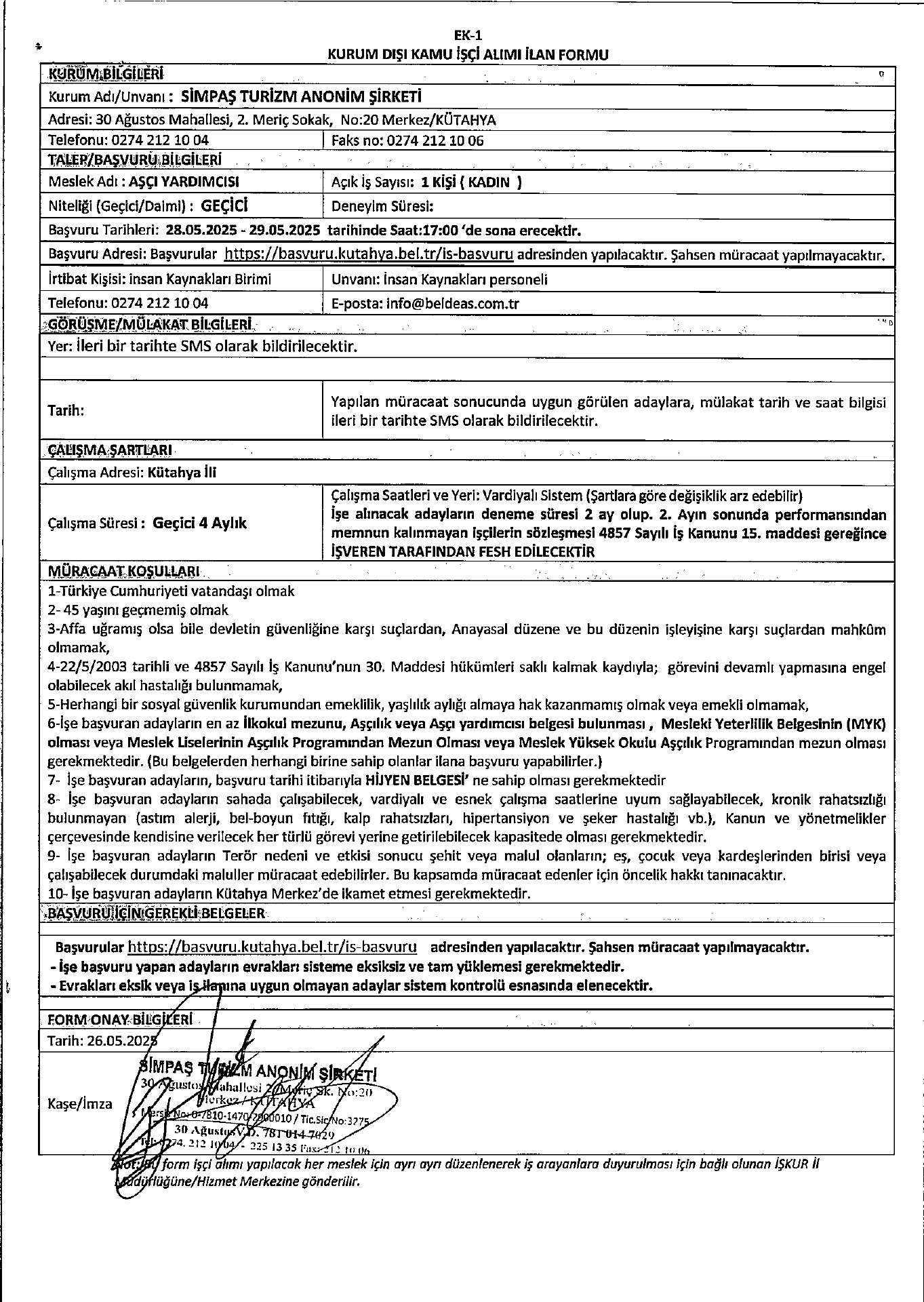 Kütahya Simpaş 1 İşçi Alacak. Son başvuru tarihi 29 mayıs 2025
