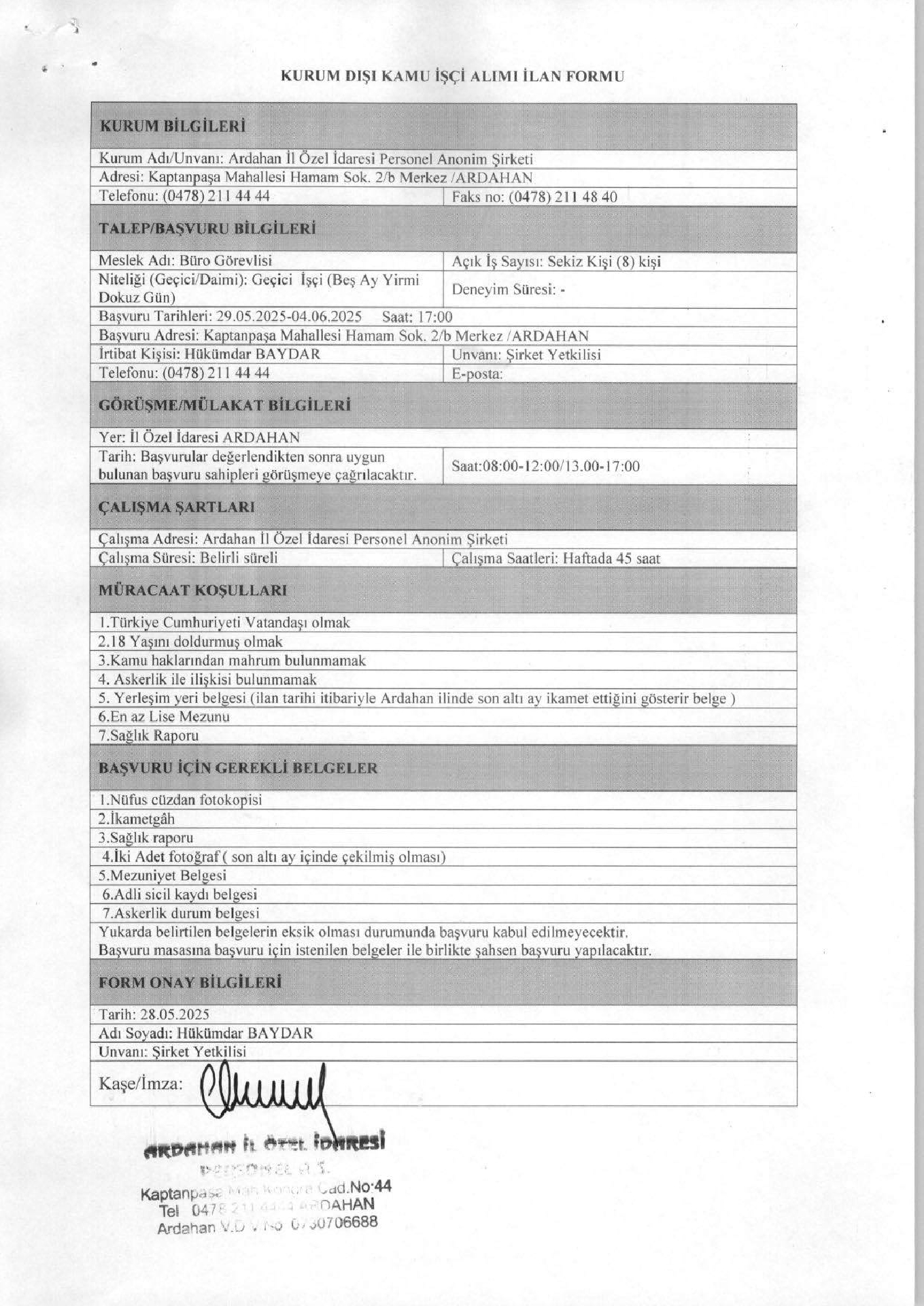 Ardahan İl Özel İdaresi Geçici 8 İşçi Alacak. Son başvuru tarihi 04 haziran 2025
