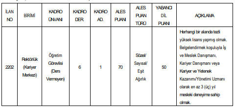 Üniversitemizin aşağıda belirtilen birimlerine; Öğretim Üyesi Dışındaki Öğretim Elemanı Kadrolarına Yapılacak Atamalarda Uygulanacak Merkezi Sınav ile Giriş Sınavlarına İlişkin Usul ve Esaslar Hakkında Yönetmelik, 2547 sayılı Yükseköğretim Kanunu ve 657 sayılı Devlet memurları Kanunu'nun 48. maddesi hükümleri uyarınca personel alınacaktır.