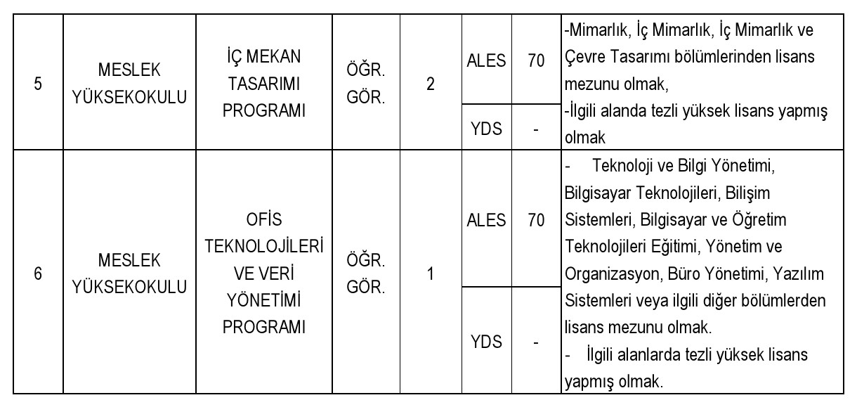 Üniversitemiz aşağıda belirtilen birimlere 2547 Sayılı Kanun'un 31. maddesi ile 09.11.2018 tarihli Resmi Gazete'de yayınlanan "Öğretim Üyesi Dışındaki Öğretim Elemanı Kadrolarına Yapılacak Atamalarda Uygulanacak Merkezi Sınav İle Giriş Sınavlarına İlişkin Usul ve Esaslar Hakkında Yönetmelik"in yürürlükteki ilgili maddelerine göre öğretim elemanı alacaktır.