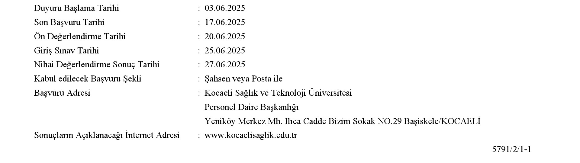 Üniversitemizin aşağıda belirtilen birimlerine 2547 sayılı Yükseköğretim Kanununun ilgili maddeleri, "Öğretim Üyeliğine Yükseltilme ve Atanma Yönetmeliği" ile "Kocaeli Sağlık ve Teknoloji Üniversitesi Öğretim Üyeliğine Yükseltilme ve Atama Kriterleri Yönergesi" hükümleri uyarınca aylık ve özlük hakları yönünden 4857 Sayılı İş Kanunu hükümlerine tabi sözleşmeli statüde tam zamanlı öğretim elemanı alınacaktır. İlan edilen kadrolara müracaat edecek adayların 657 Sayılı Devlet Memurları Kanunu'nun 48 inci maddesindeki genel şartlar ile ilgili Kanun ve Yönetmelikte belirtilen koşulları sağlamış olmaları ve aşağıda belirtilen belgelerle birlikte şahsen ilanda belirtilen adrese başvurmaları gerekmektedir.
