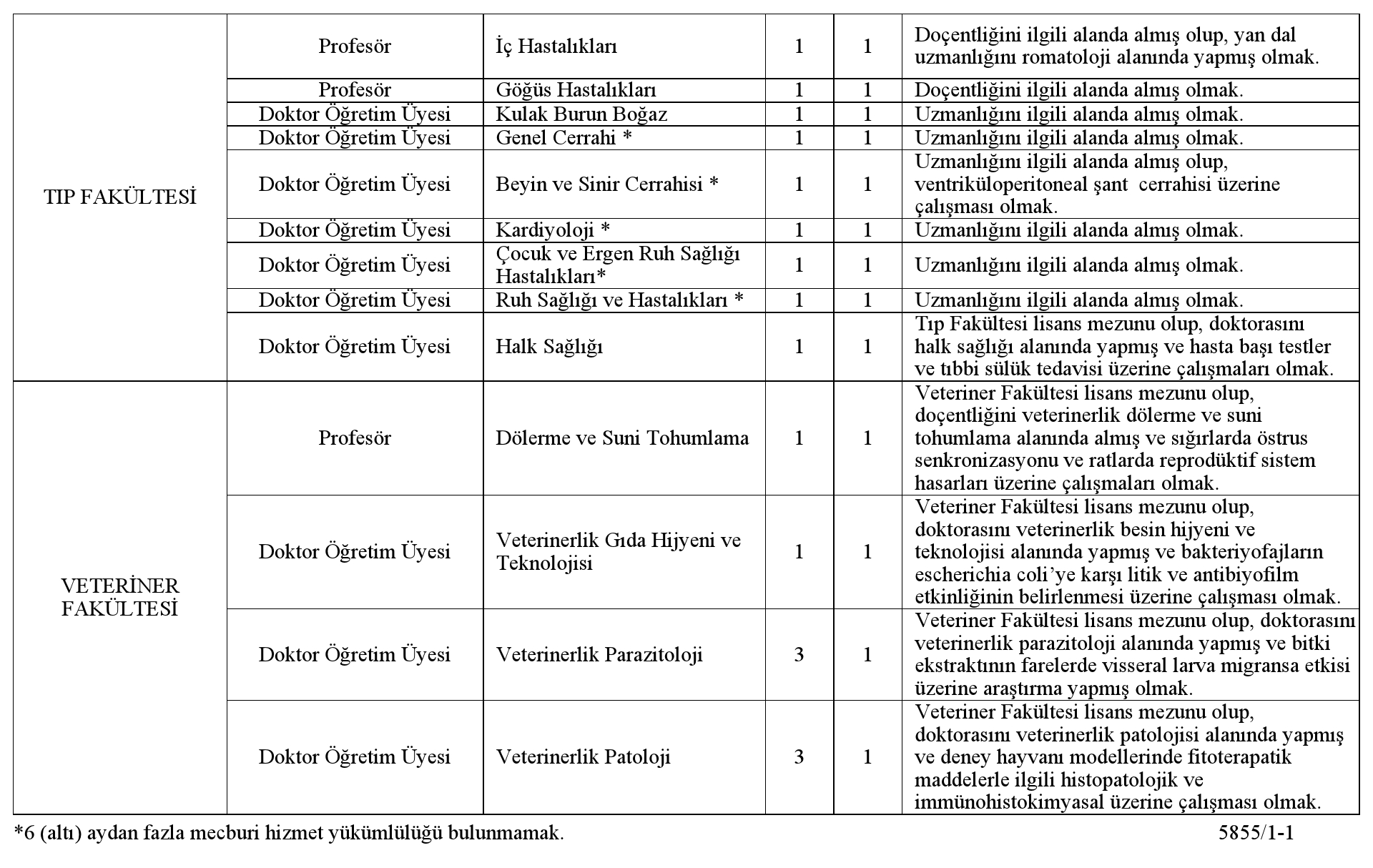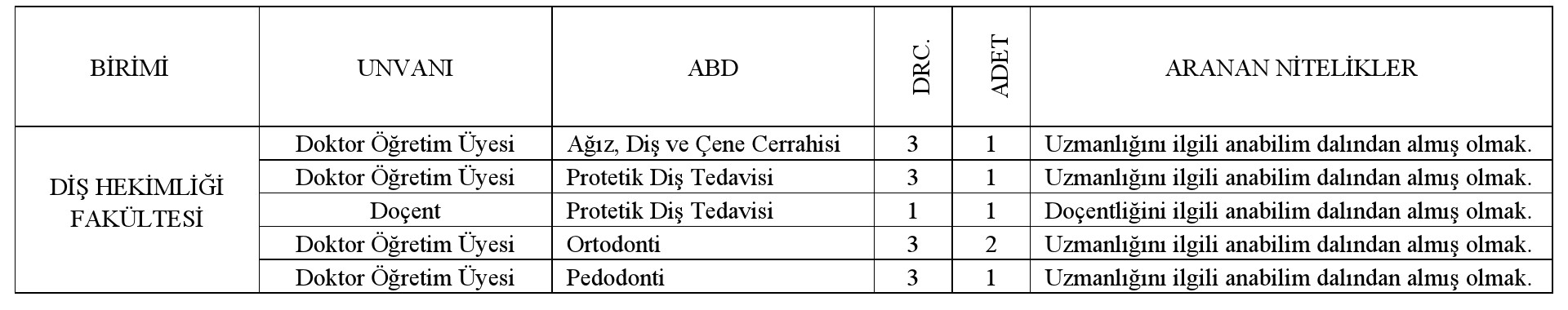 Üniversitemizin aşağıda belirtilen birimlerine, 2547 sayılı Yükseköğretim Kanunu, Öğretim Üyeliğine Yükseltilme ve Atanma Yönetmeliği, 657 sayılı Devlet Memurları Kanunu'nun 48. Maddesi ve Üniversitemiz Akademik Yükseltilme ve Atanma Yönergesinde belirtilen şartları sağlayanlardan Öğretim Üyesi alınacaktır.