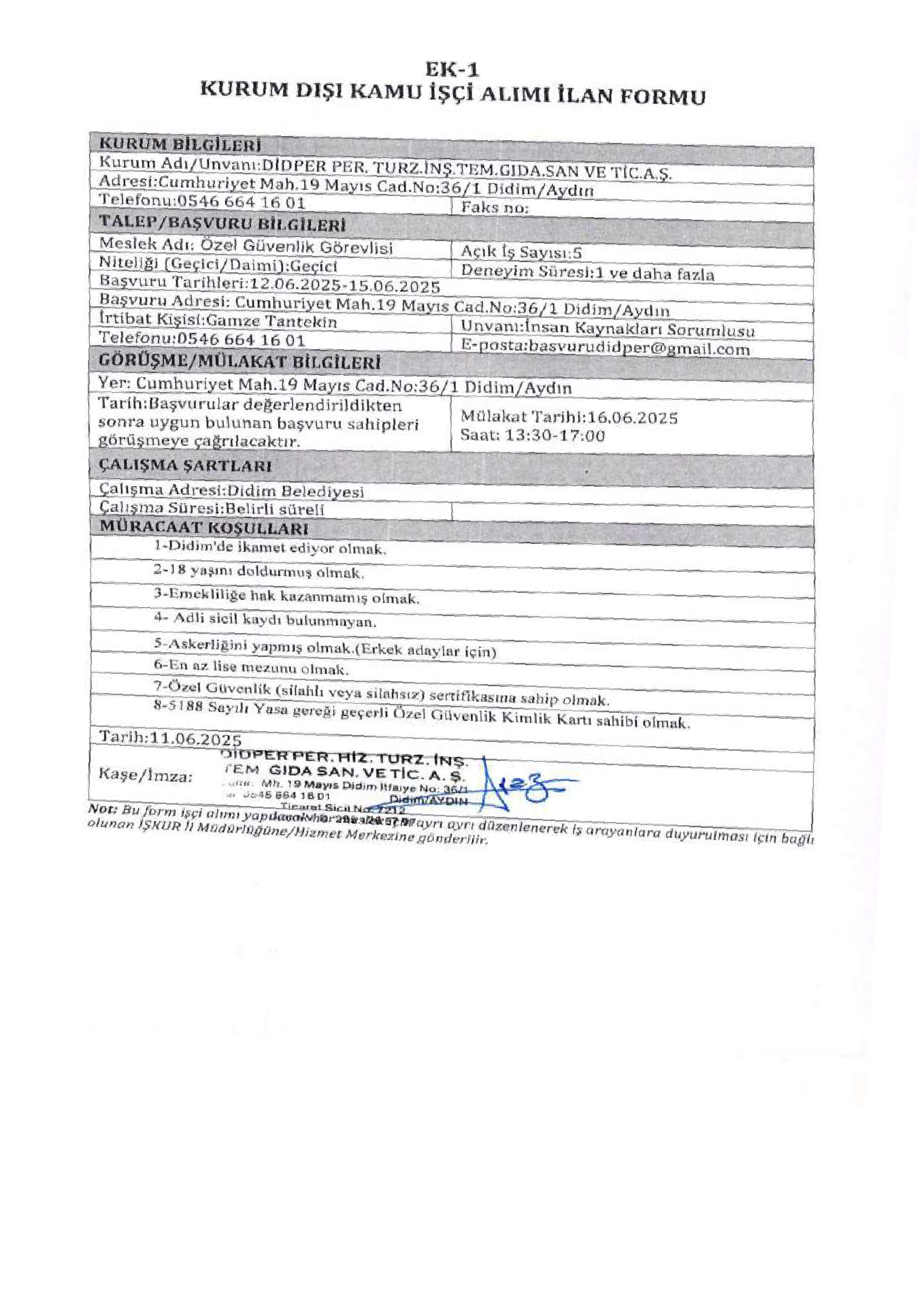 Aydın Didper Geçici 5 İşçi Alacak. Son başvuru tarihi 15 haziran 2025
