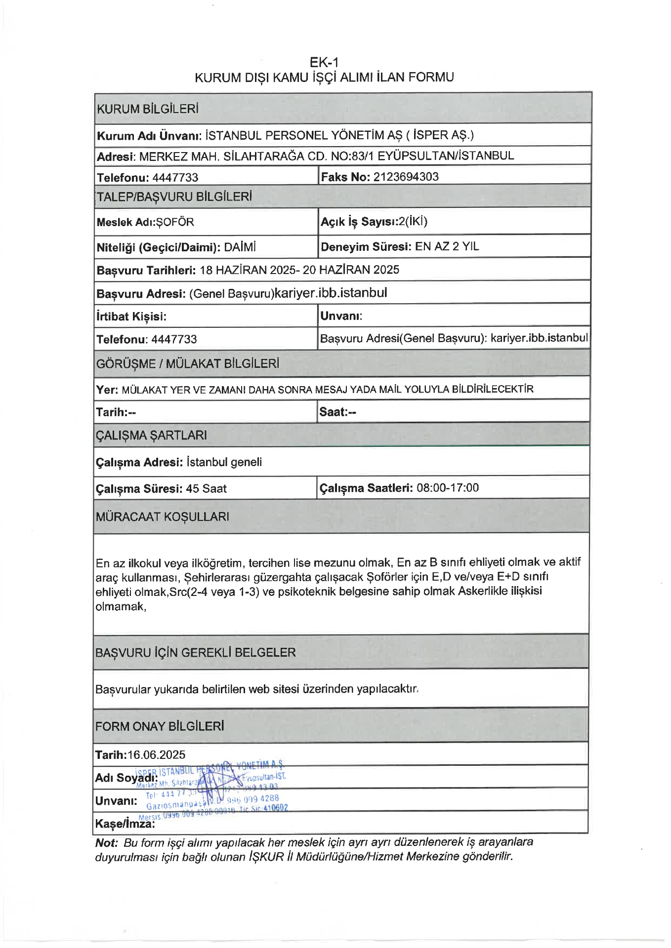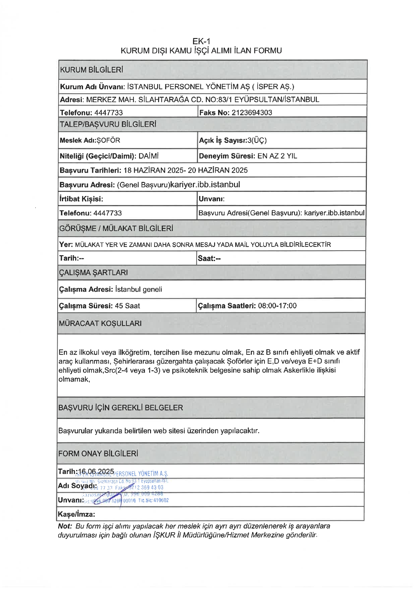 İstanbul Personel Yönetim Aş. 5 İşçi Alacak. Son başvuru tarihi 20 haziran 2025