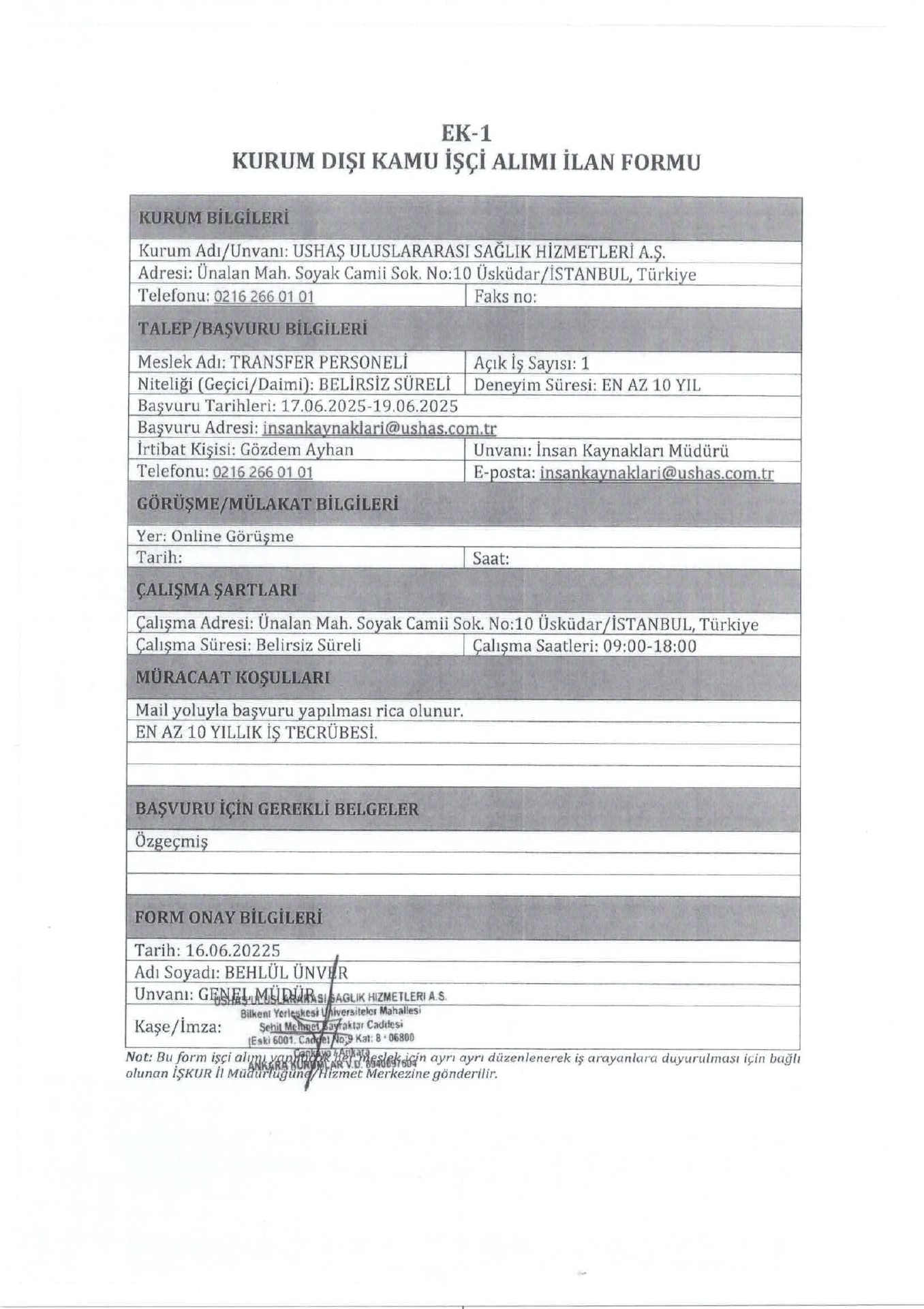 İstanbul Ushaş 1 İşçi Alacak. Son başvuru tarihi 19 haziran 2025