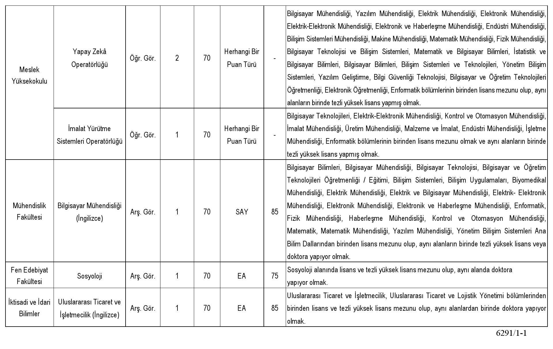 2547 sayılı Yükseköğretim Kanununda belirtilen koşullar ile 09.11.2018 Tarihli 30590 sayılı Resmi Gazete'de yayımlanan "Öğretim Üyesi Dışındaki Öğretim Elemanı Kadrolarına Yapılacak Atamalarda Uygulanacak Merkezi Sınav ile Giriş Sınavlarına İlişkin Usul ve Esaslar Hakkında Yönetmelik" Hükümleri ve 17 Nisan 2020 Tarih ve 31102 Sayılı Resmi Gazete'de yayımlanan "Yükseköğretim Kanunu İle Bazı Kanunlarda Değişiklik Yapılmasına Dair Kanun" maddesi uyarınca, ARAŞTIRMA GÖREVLİSİ ve ÖĞRETİM GÖREVLİSİ alınacaktır.