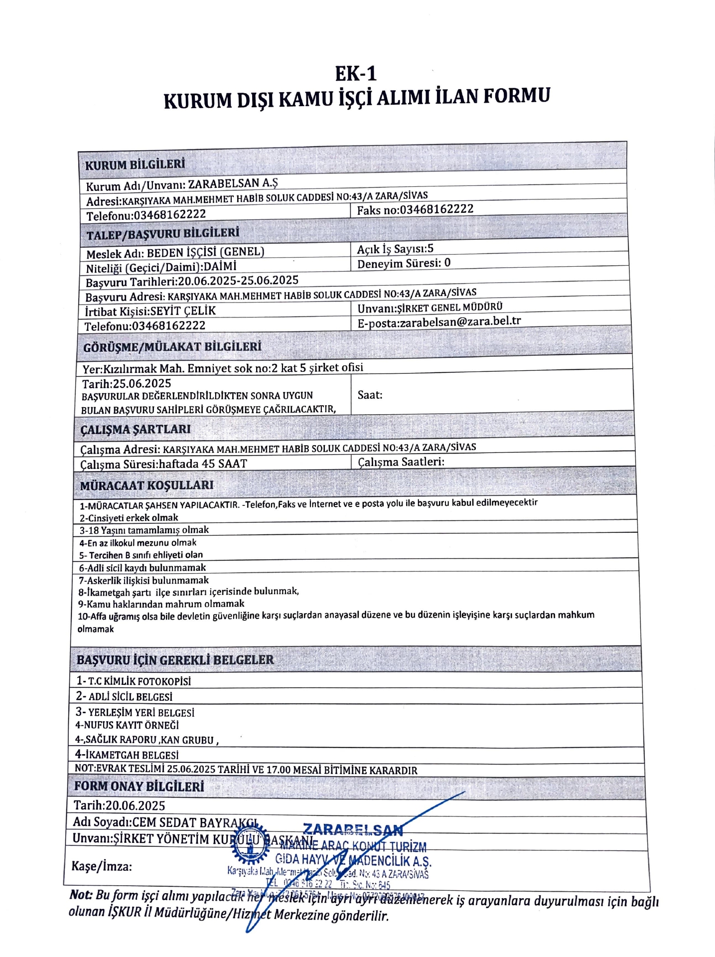 Sivas Zara Belediyesi 5 İşçi Alacak. Son başvuru tarihi 25 haziran 2025