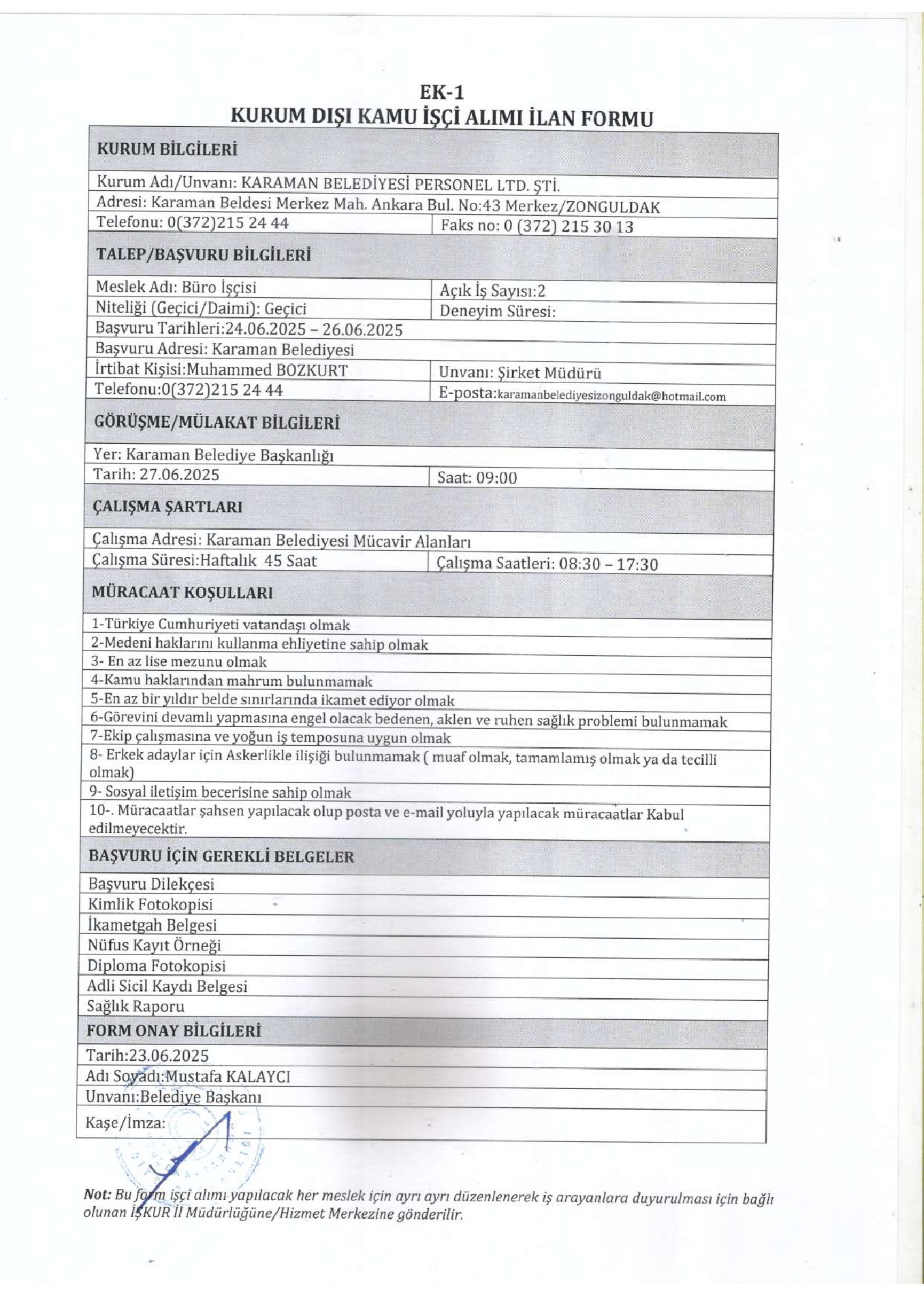 Zonguldak Karaman Belediyesi Geçici 5 İşçi Alacak. Son başvuru tarihi 26 haziran 2025
