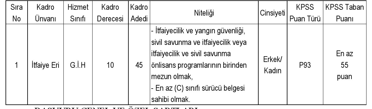 İlan edilen boş itfaiye eri kadrolarına atanmak için başvuracak adayların, 657 sayılı Devlet Memurları Kanununun 40 ıncı maddesi ile 48 inci maddesinin birinci fıkrasının (A) bendinde belirtilen aşağıdaki genel şartlara sahip olmaları gerekmektedir;