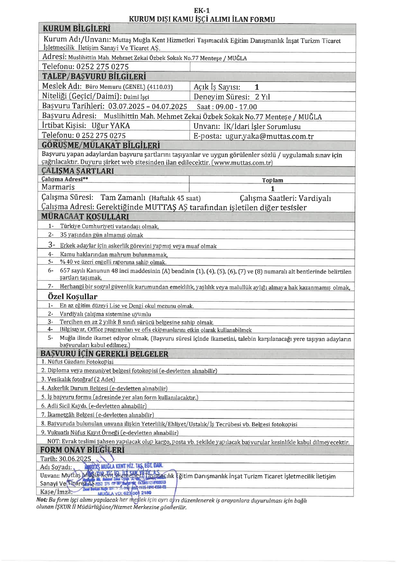Muğla Muttaş 1 İşçi Alacak. Son başvuru tarihi 4 temmuz 2025