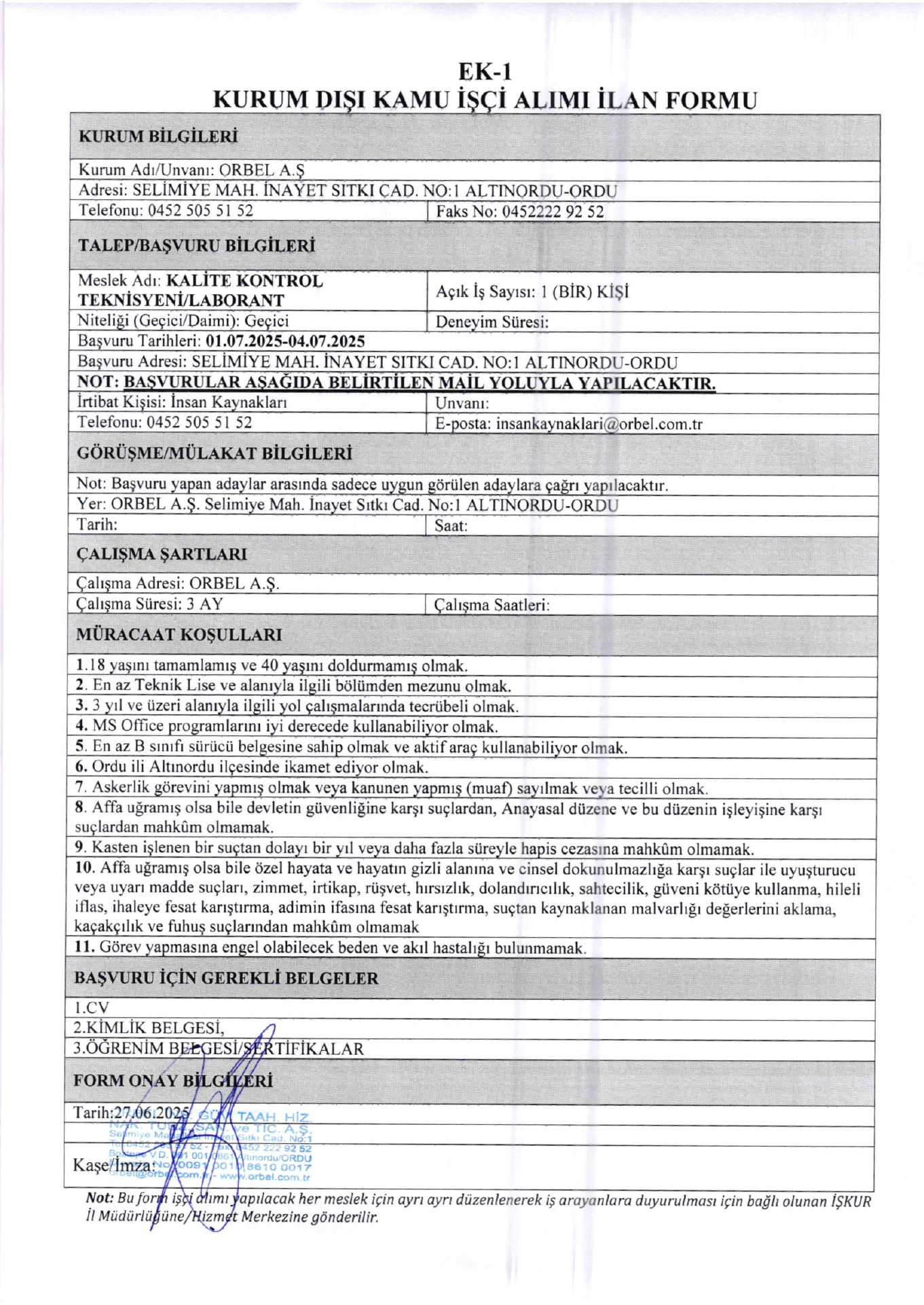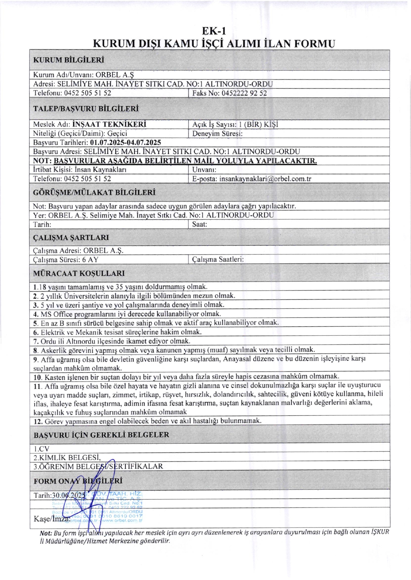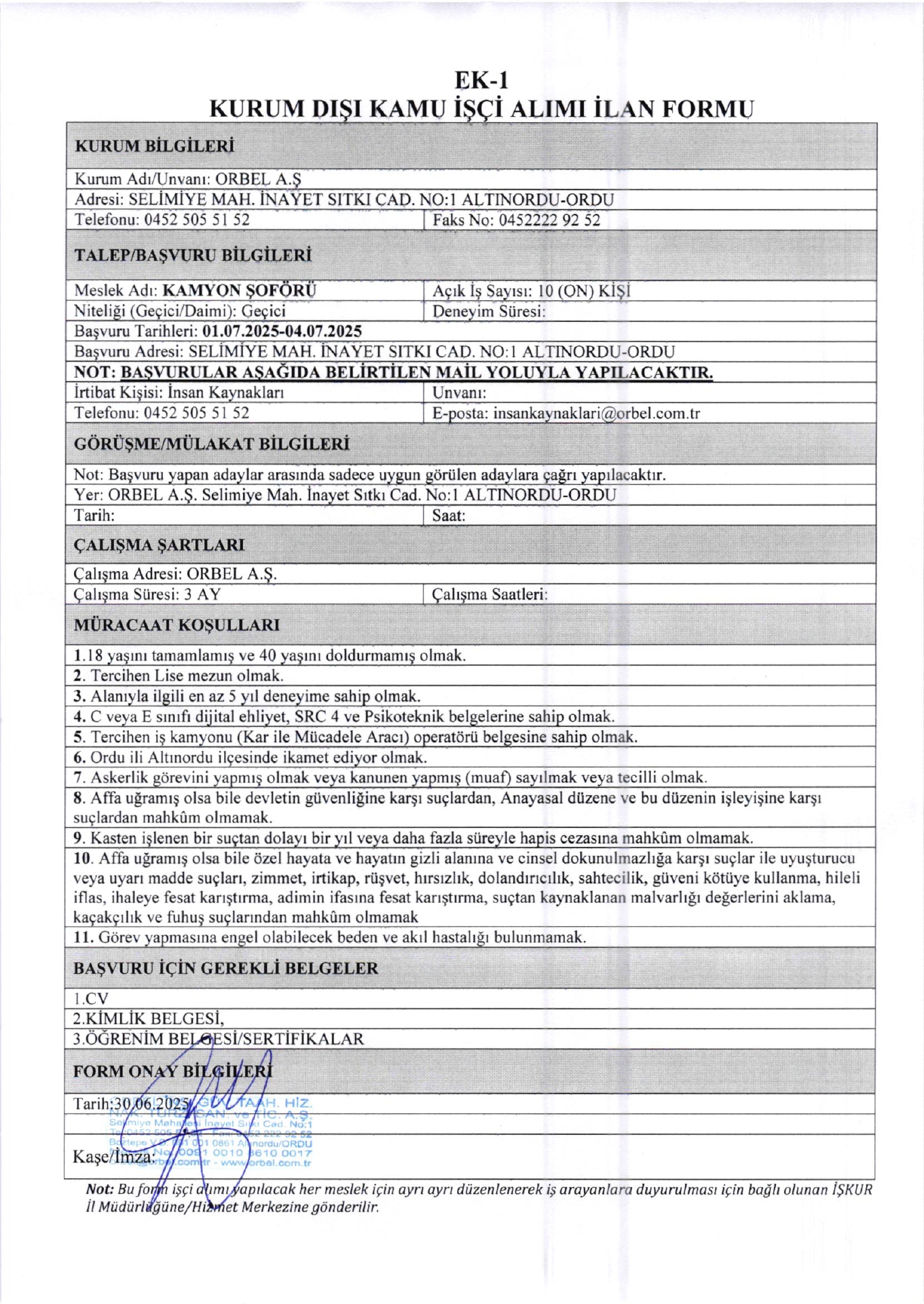 Ordu Orbel Geçici 12 İşçi Alacak. Son başvuru tarihi 4 temmuz 2025