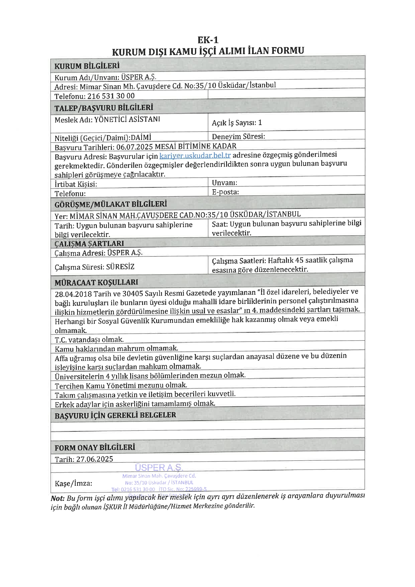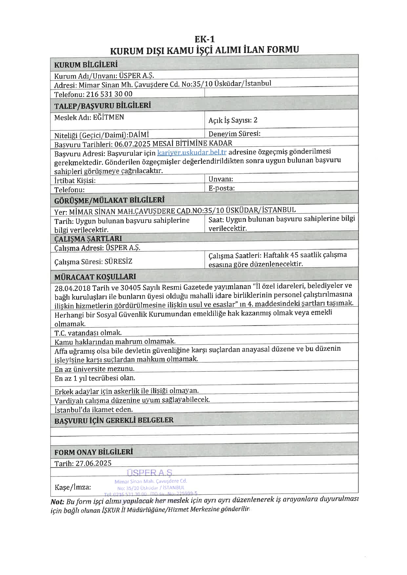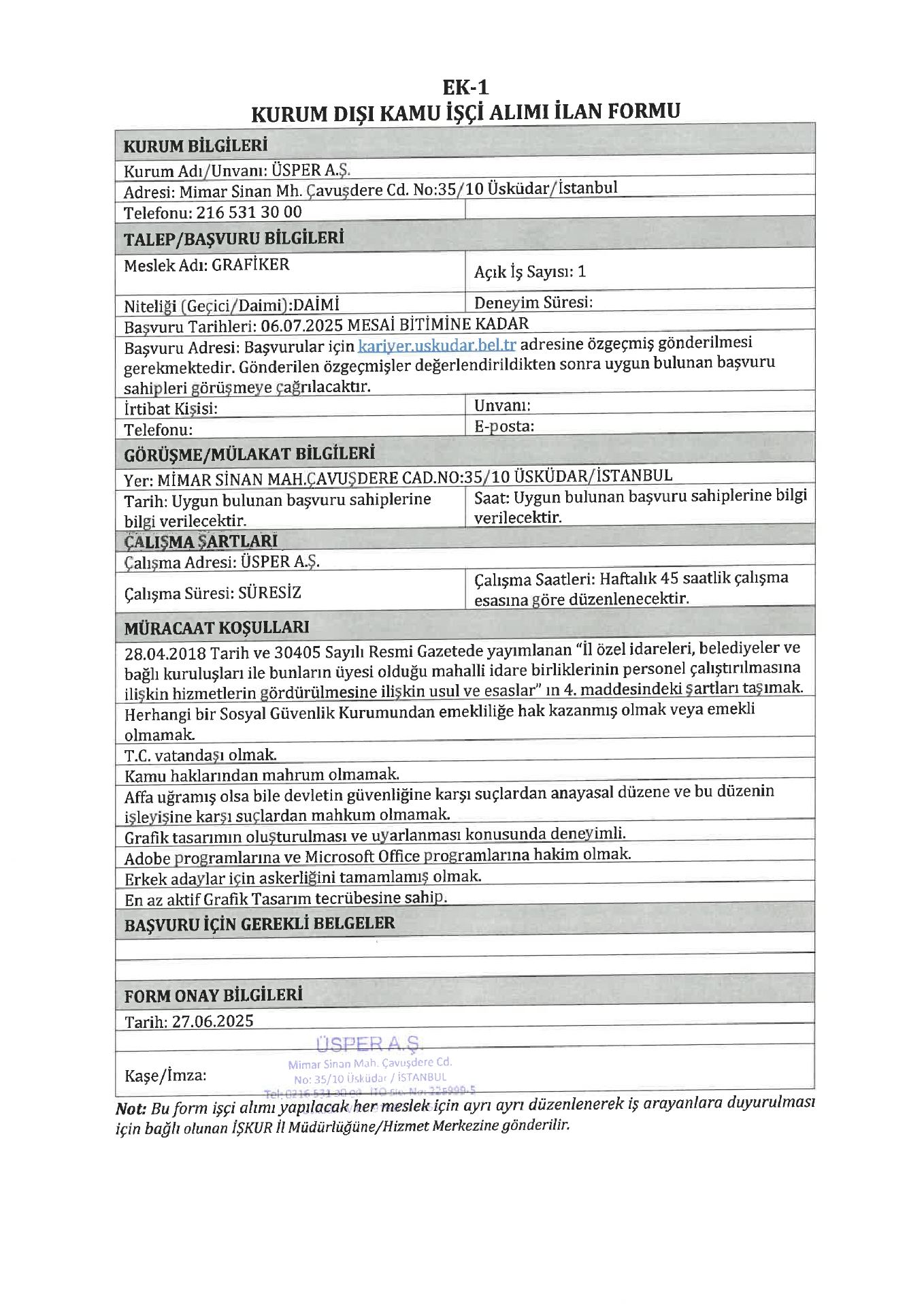 İstanbul Üsper 4 İşçi Alacak. Son başvuru tarihi 6 temmuz 2025