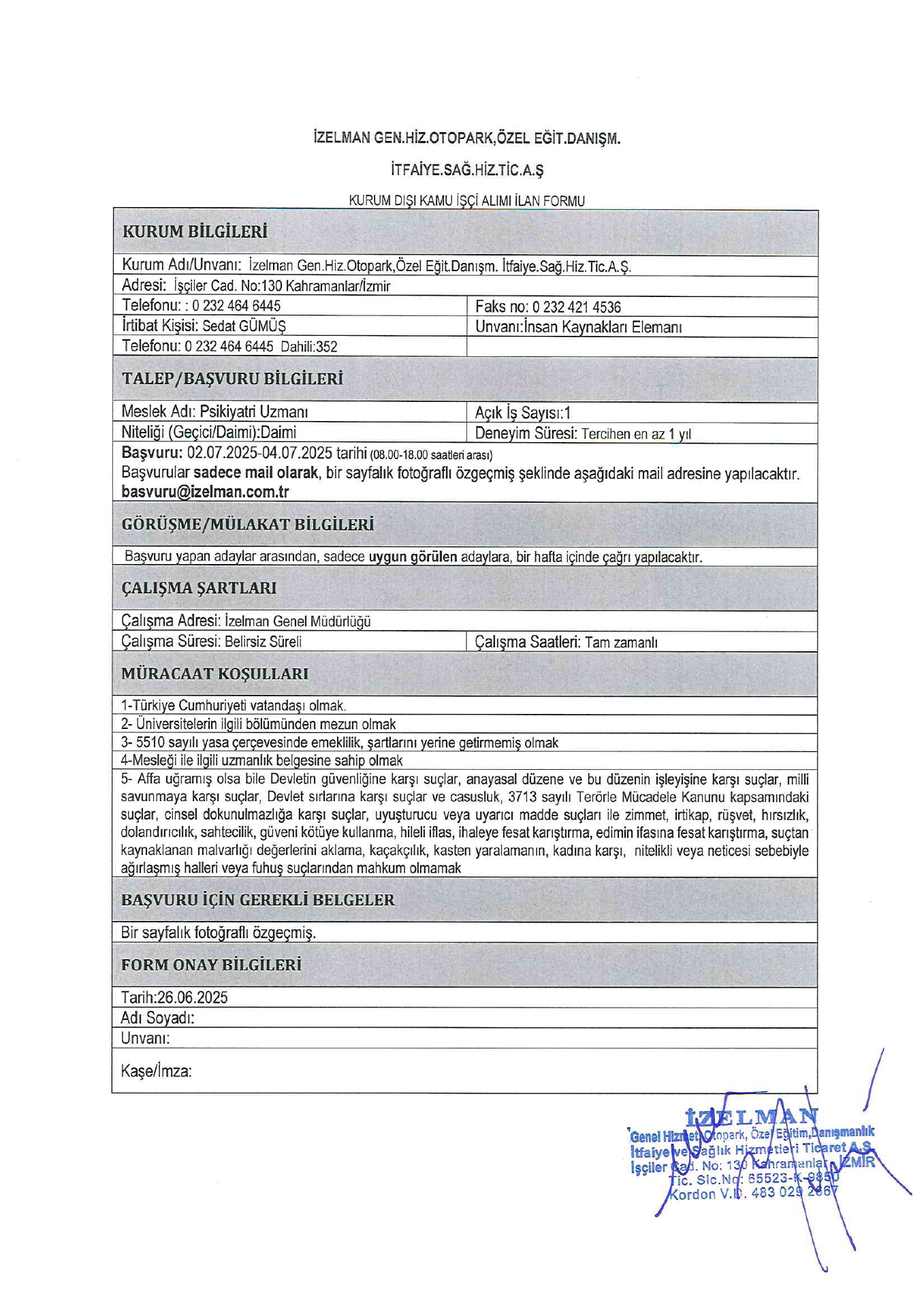 İzmir İzelman 1 İşçi Alacak. Son başvuru tarihi 4 temmuz 2025