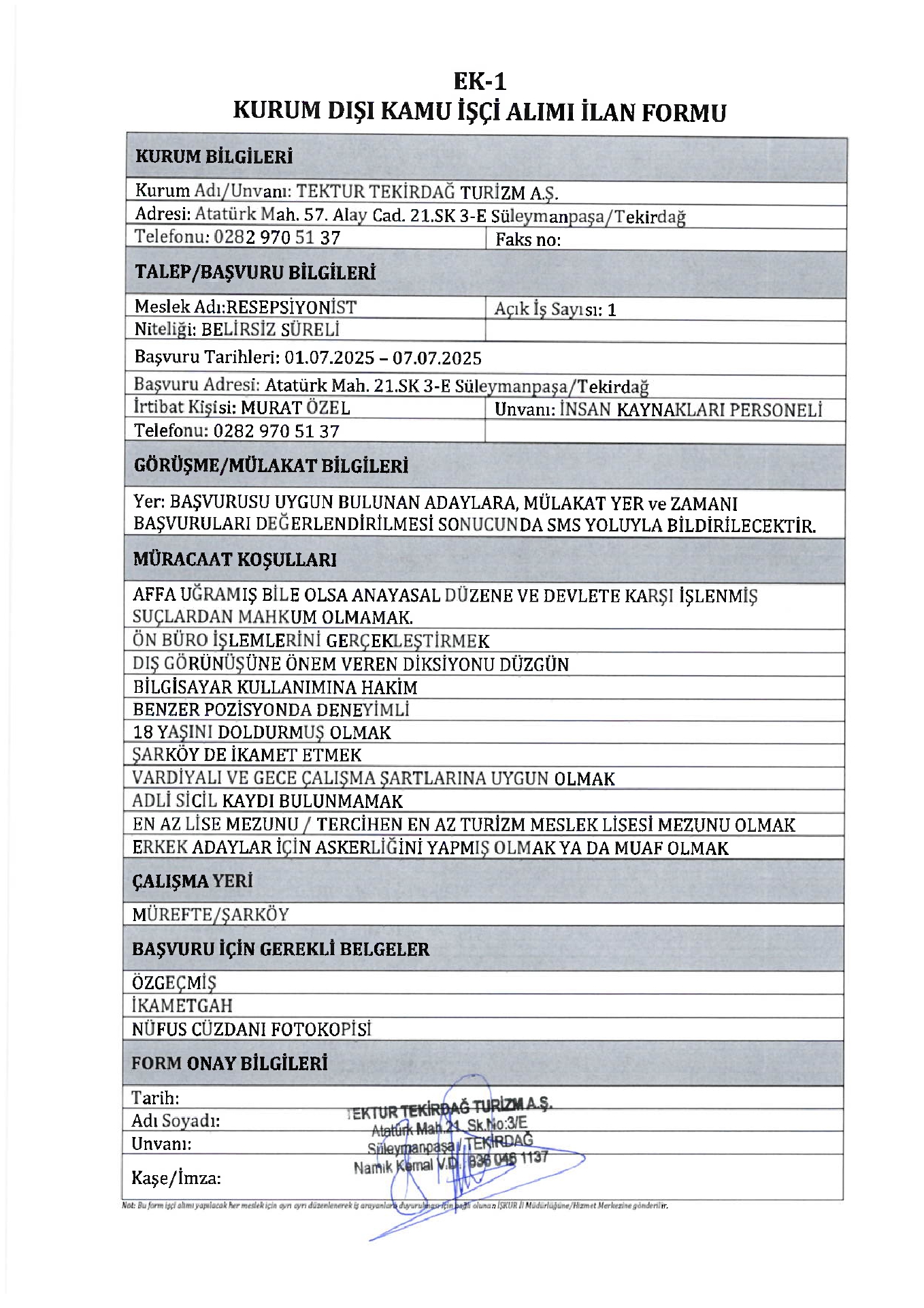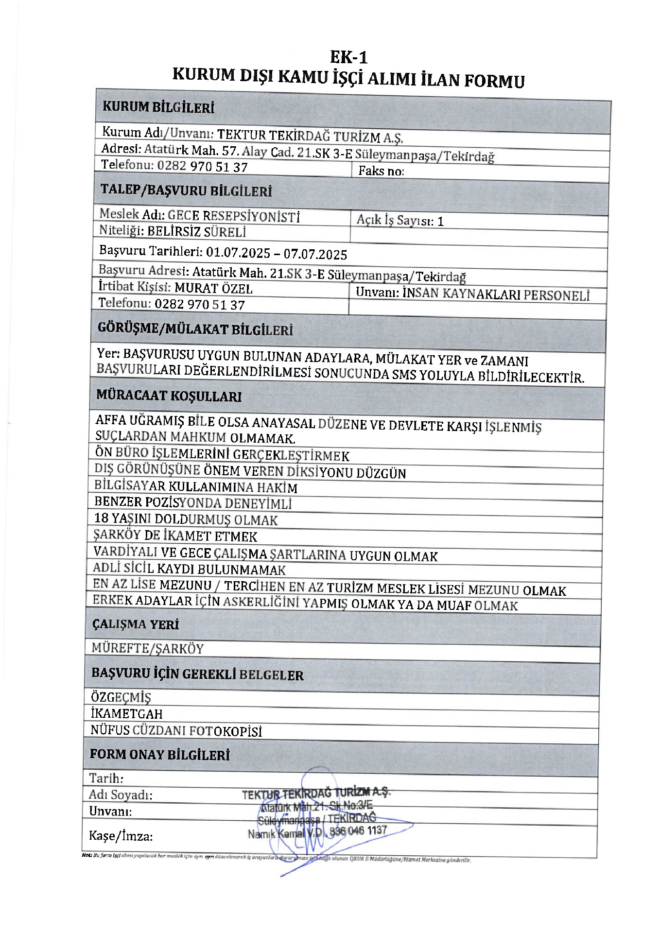 Tekirdağ Tektur 2 İşçi Alacak. Son başvuru tarihi 7 temmuz 2025