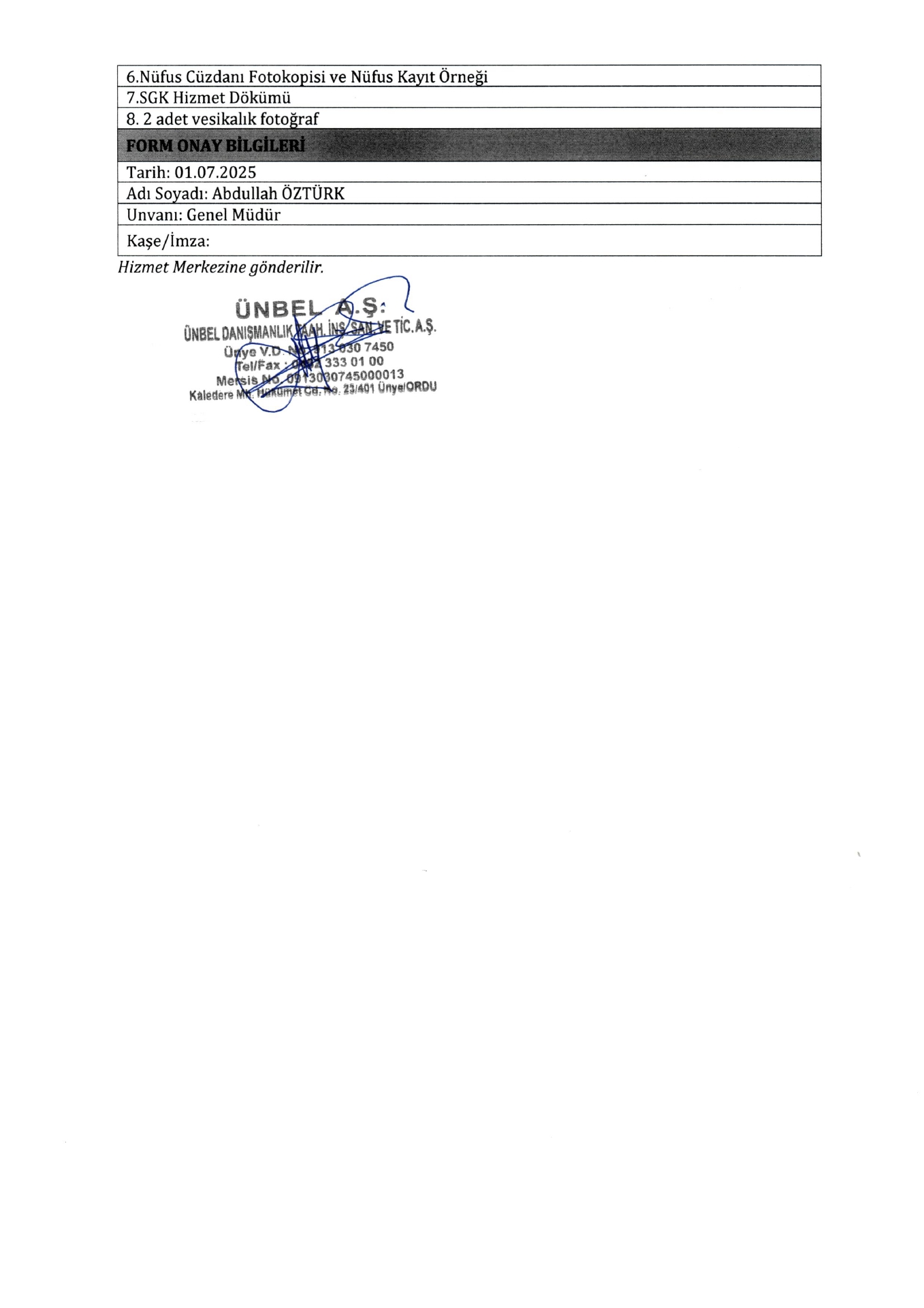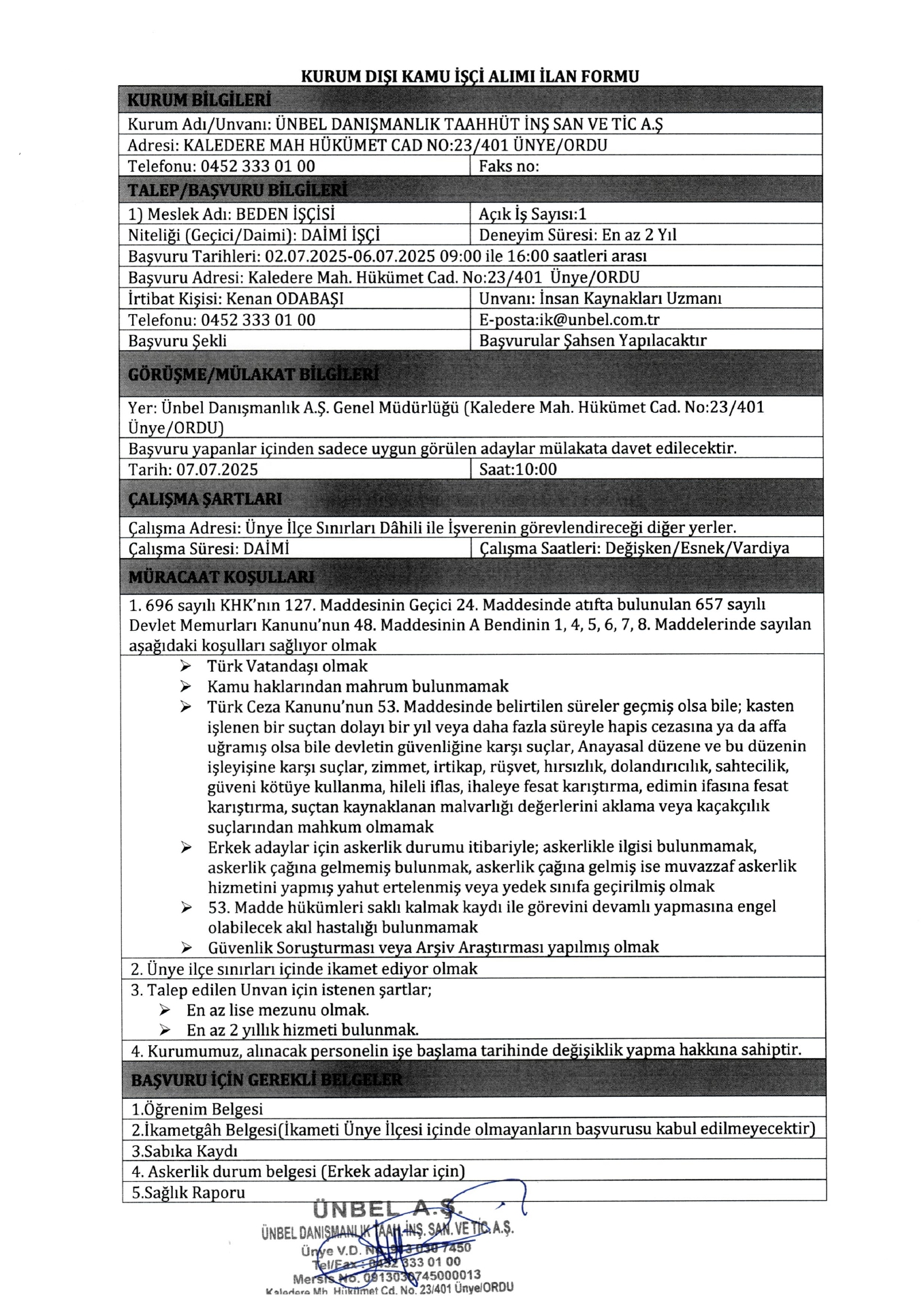 Ordu Ünbel Danışmanlık 1 İşçi Alacak. Son başvuru tarihi 6 temmuz 2025