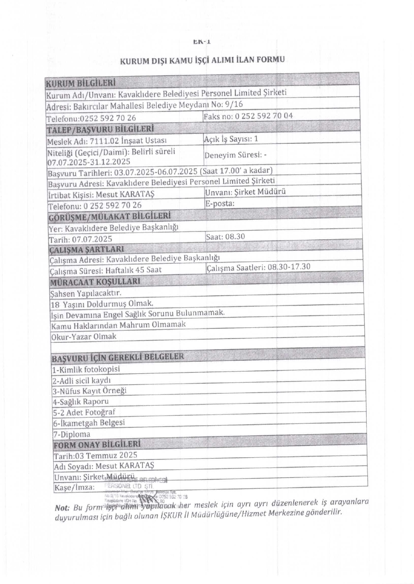 Muğla Kavaklıdere Belediyesi 1 İşçi Alacak