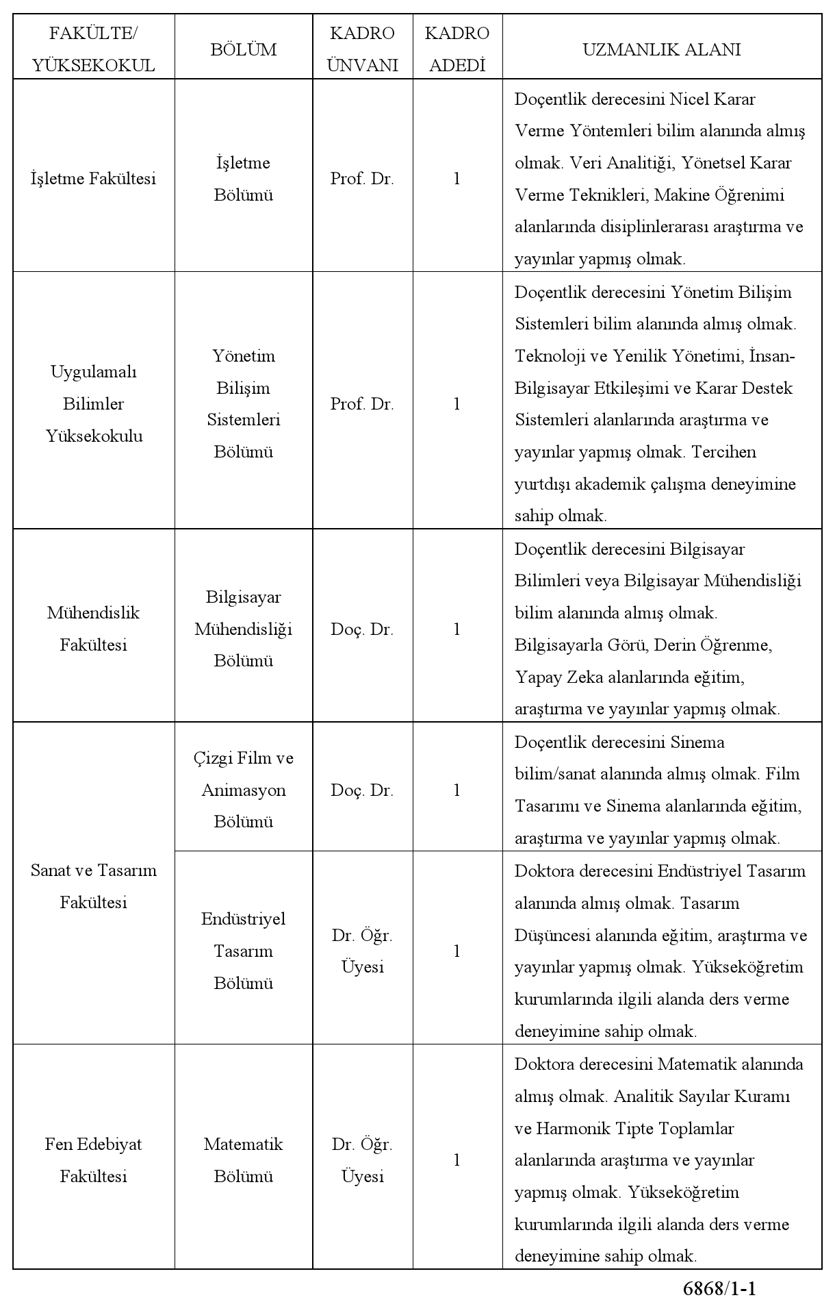 Üniversitemiz ilgili Birimlerine 2547 sayılı Kanun ile bu Kanuna dayanılarak Yükseköğretim Kurulu Başkanlığı'nca 12.06.2018 tarih ve 30449 sayılı Resmi Gazete'de yayımlanan "Öğretim Üyeliğine Yükseltilme ve Atanma Yönetmeliği", Üniversitemiz resmi erişim sayfasında yayımlanan "Akademik Kadrolara Atama ve Yükseltmeler Hakkında Yönerge"de belirtilen kıstasları yerine getirmiş olmak kaydıyla ilgili alanlarda uzmanlaşmış öğretim üyeleri alınacaktır.