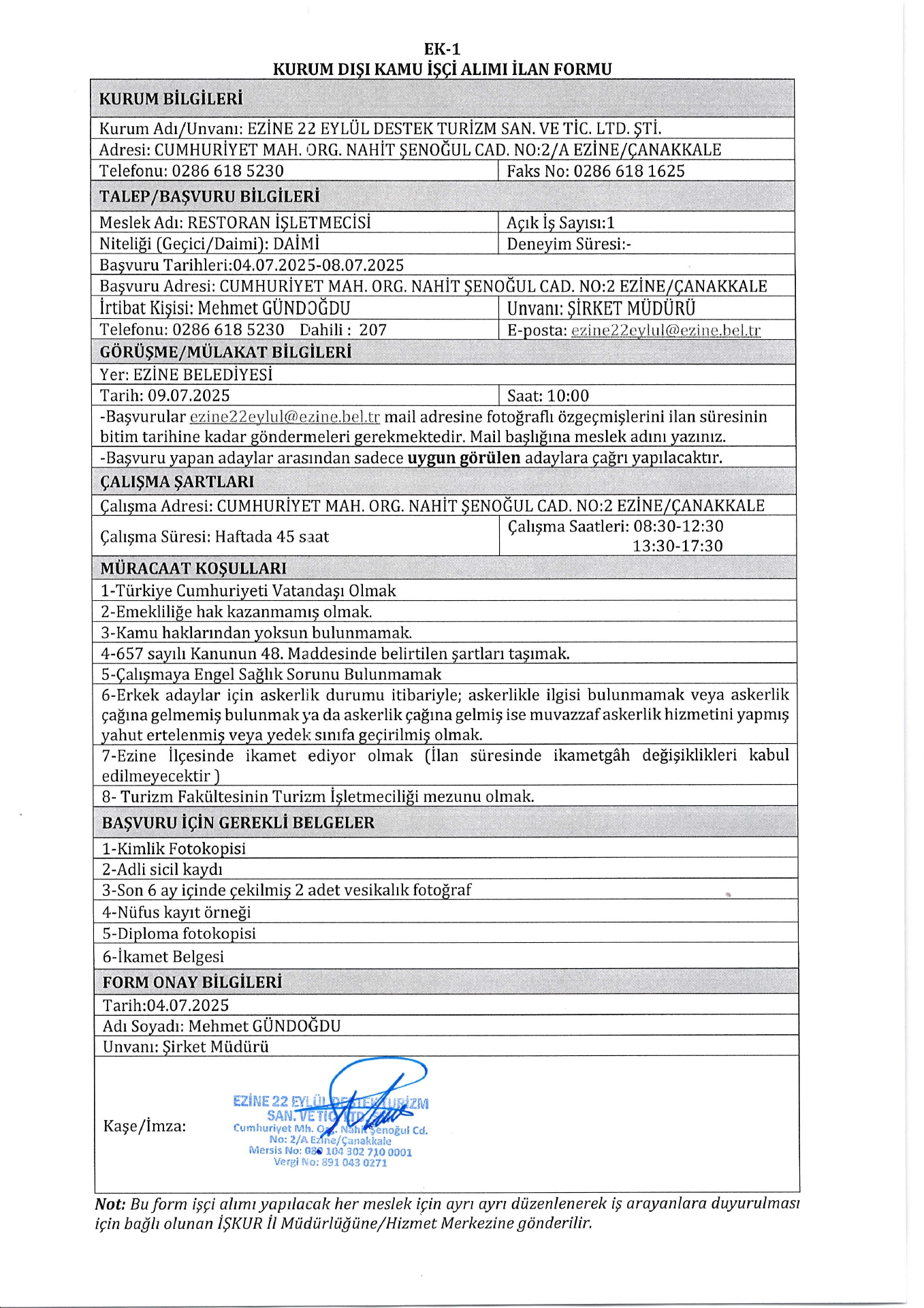Çanakkale Ezine 22 Eylül Destek Turizm 1 İşçi Alacak. Son başvuru tarihi 8 temmuz 2025