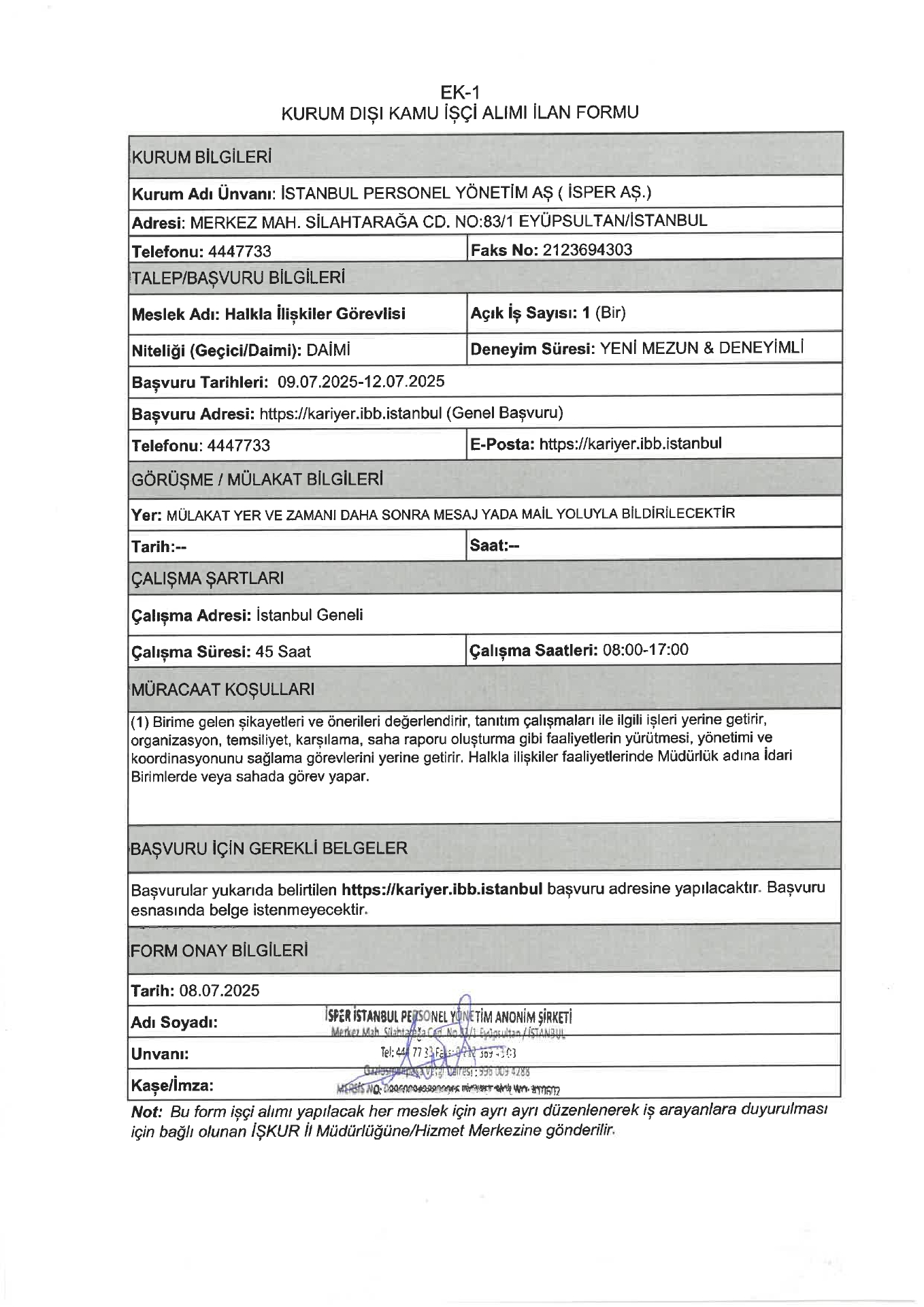 İstanbul Personel Yönetim Aş. 1 İşçi Alacak. Son başvuru tarihi 12 temmuz 2025