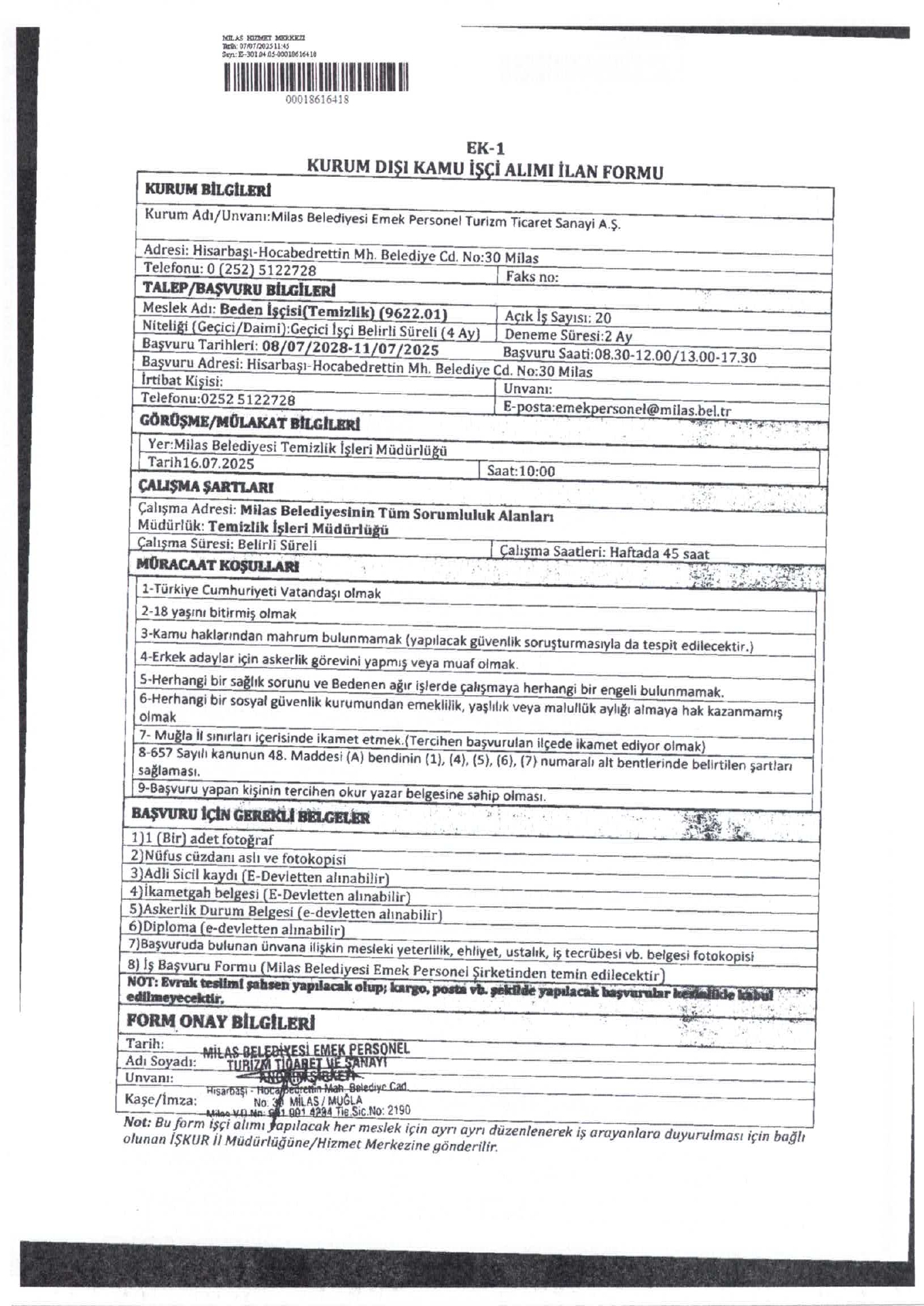 Muğla Milas Belediyesi Geçici 20 İşçi Alacak. Son başvuru tarihi 11 temmuz 2025