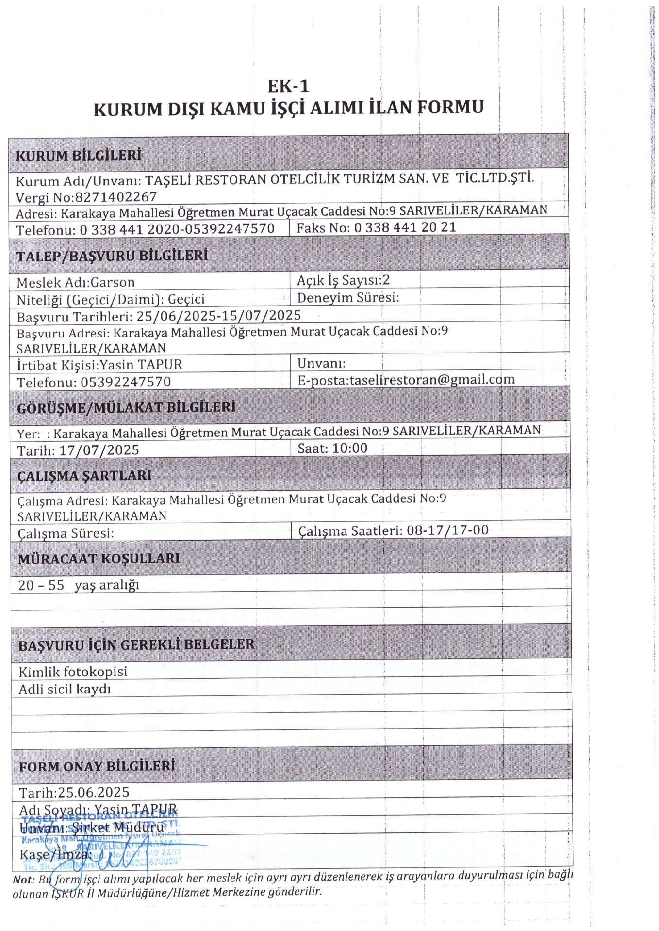 Karaman Taşeli Restıran Geçici 2 İşçi Alacak. Son başvuru tarihi 15 temmuz 2025