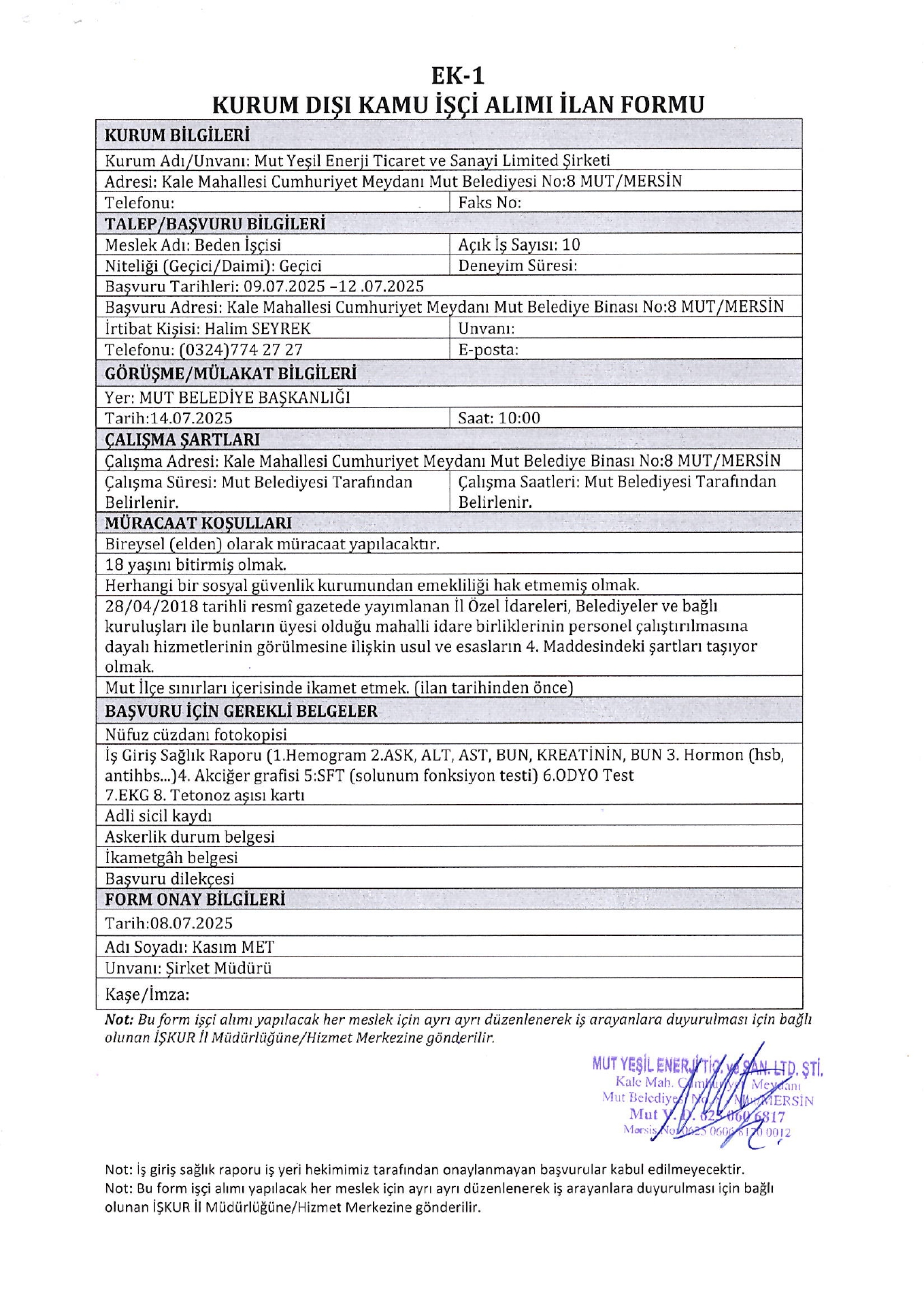 Mersin Mud Yeşil Enerji Geçici 10 İşçi Alacak. Son başvuru tarihi 12 temmuz 2025