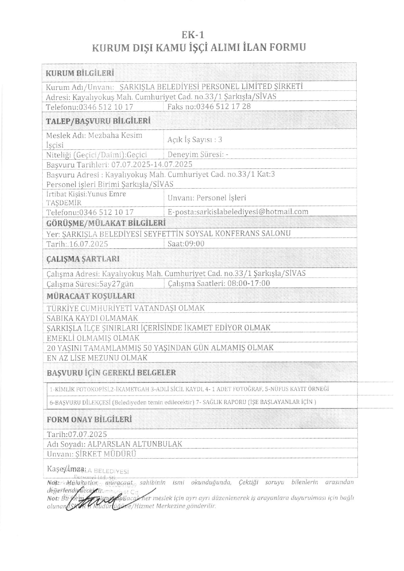 Sivas Şarkışla Belediyesi Geçici 3 İşçi Alacak. Son başvuru tarihi 14 temmuz 2025
