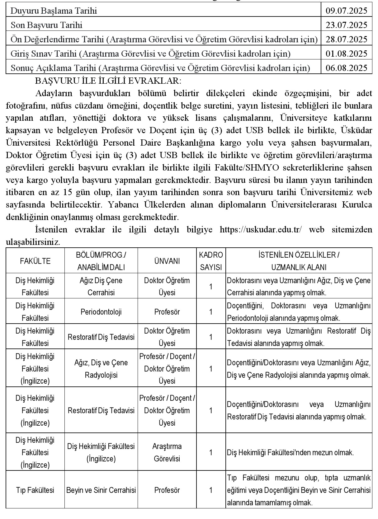 Üsküdar Üniversitesi Öğretim Üyesi Alım İlanı. Son başvuru tarihi 23 temmuz 2025