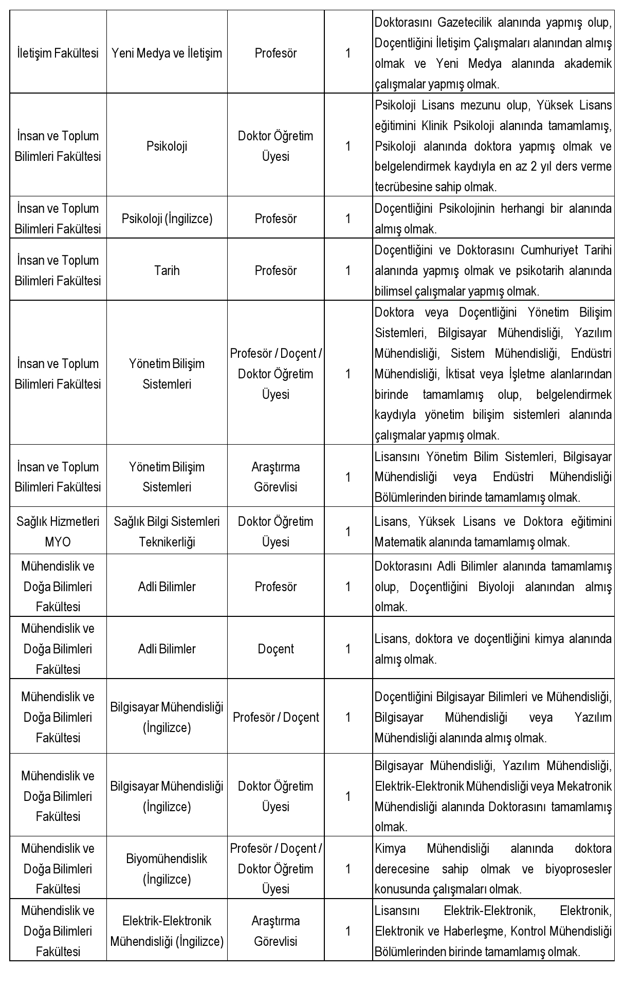 . İngilizce Fakülte/Bölüm/Anabilim Dalı için Profesör, Doçent ve Dr. Öğretim Üyesi aday/adayların Yükseköğretim Kurumlarında Yabancı Dil Öğretimi ve Yabancı Dille Öğretim Yapılmasında Uyulacak Esaslara İlişkin Yönetmeliğin" de belirtilen şartları taşıması gerekmektedir. (İngilizce Yabancı Dil Puanı: En az 85 puan olması gerekmektedir.)