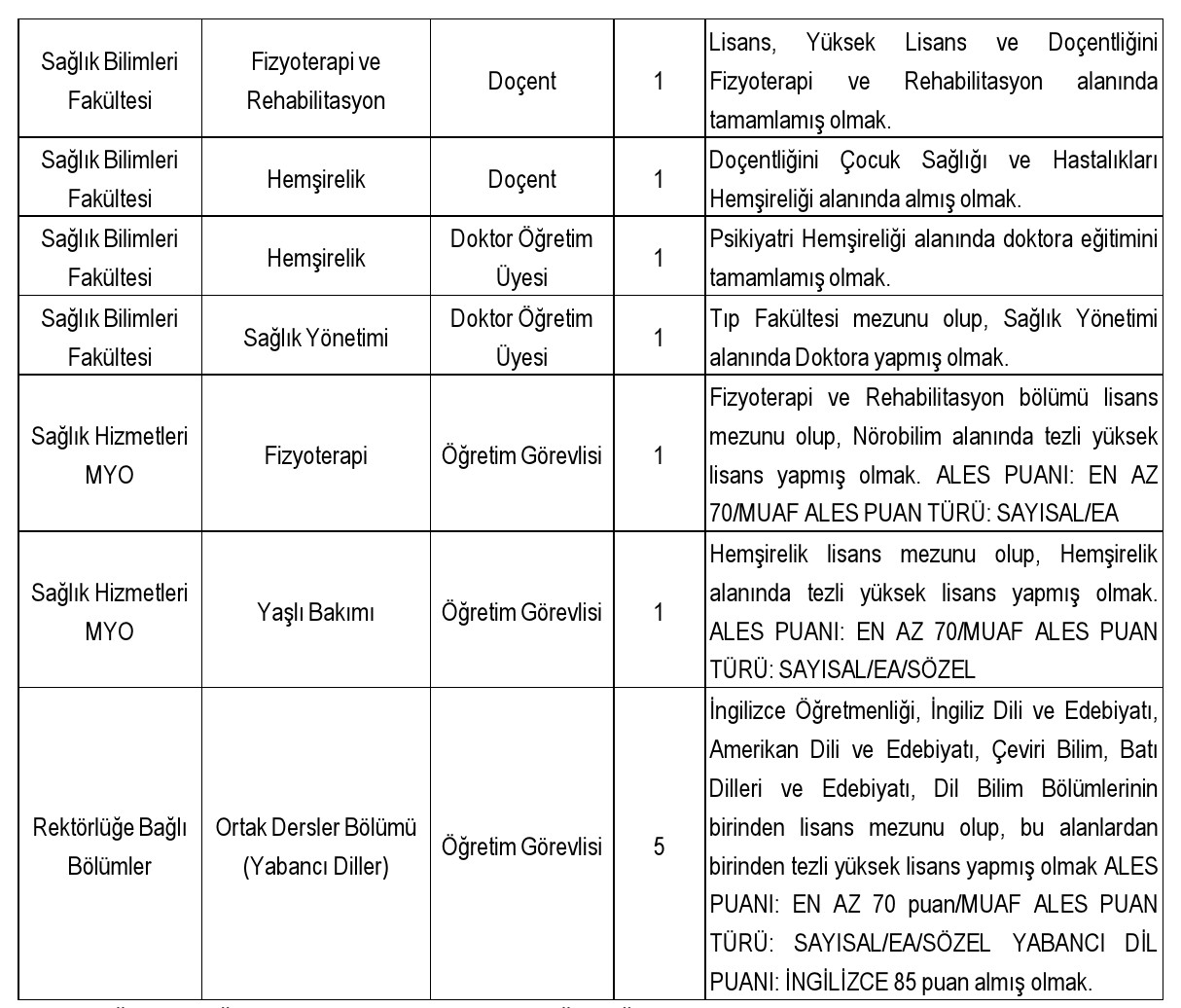 Diğer Kadrolar için ise ilgili Fakülte/Sağlık Hizmetleri Meslek Yüksekokulu Sekreterlikleri,