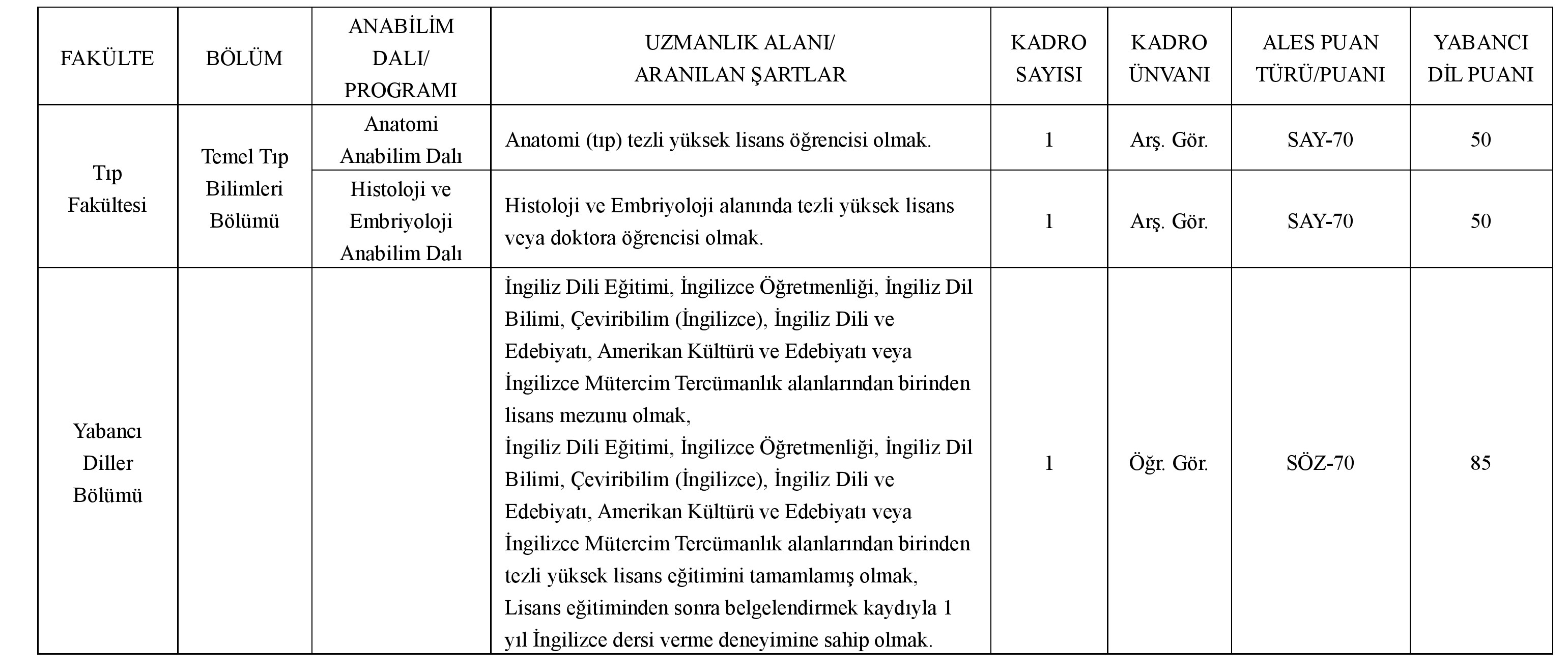 *Birden fazla ilan şartı yazan kadrolara başvurabilmek için belirtilen bütün şartları birlikte sağlamak gerekmektedir.