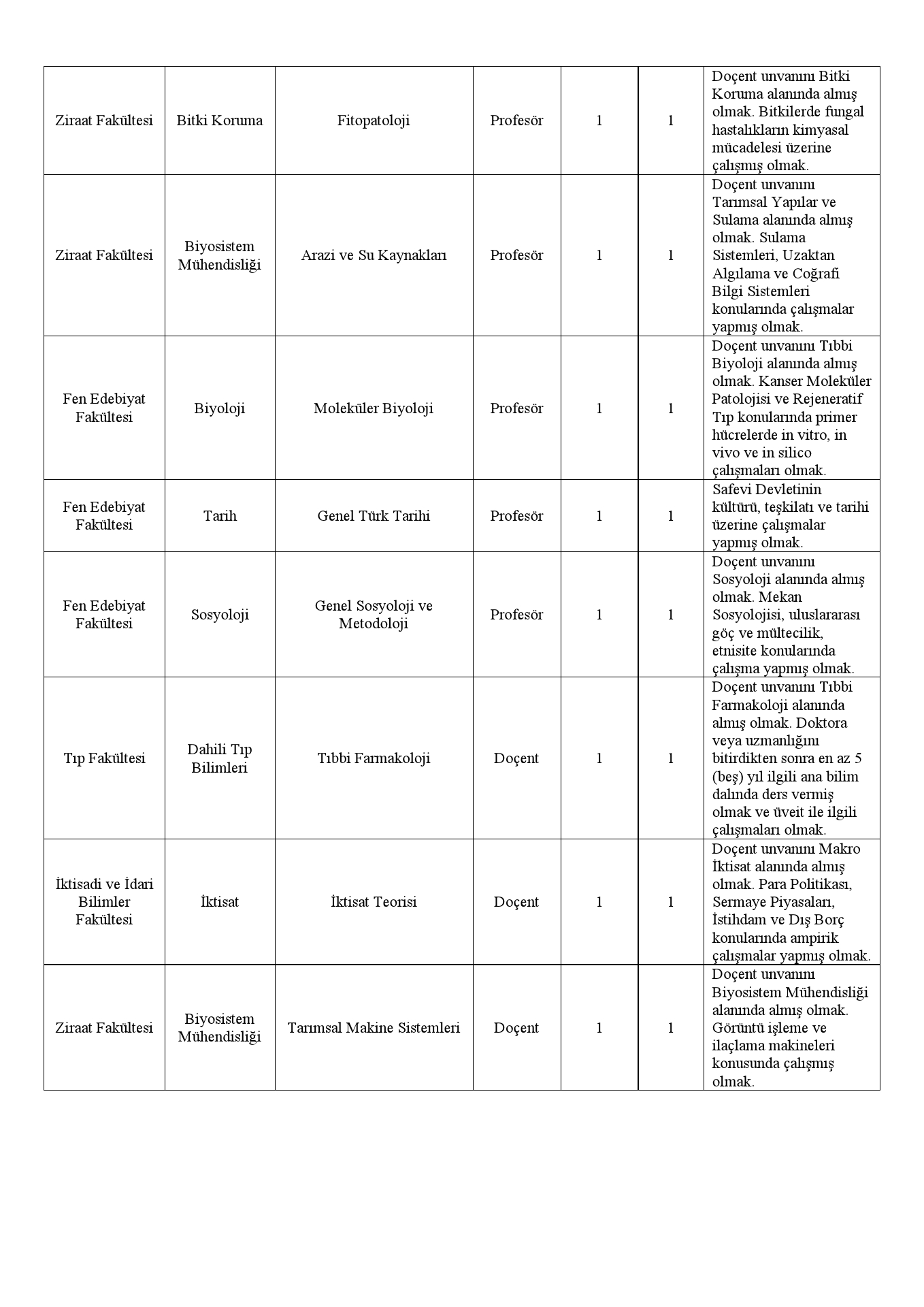 Üniversitemizin aşağıda belirtilen birimlerine, 2547 Sayılı Kanun, Öğretim Üyeliğine Yükselme ve Atama Yönetmeliği ve Yükseköğretim Kurulu Başkanlığınca onaylanan Üniversitemiz Öğretim Üyeliği Kadrolarına Başvuru İçin Gerekli Koşullar ve Uygulama Esasları Yönergesi hükümlerine göre Öğretim Üyesi alınacaktır.